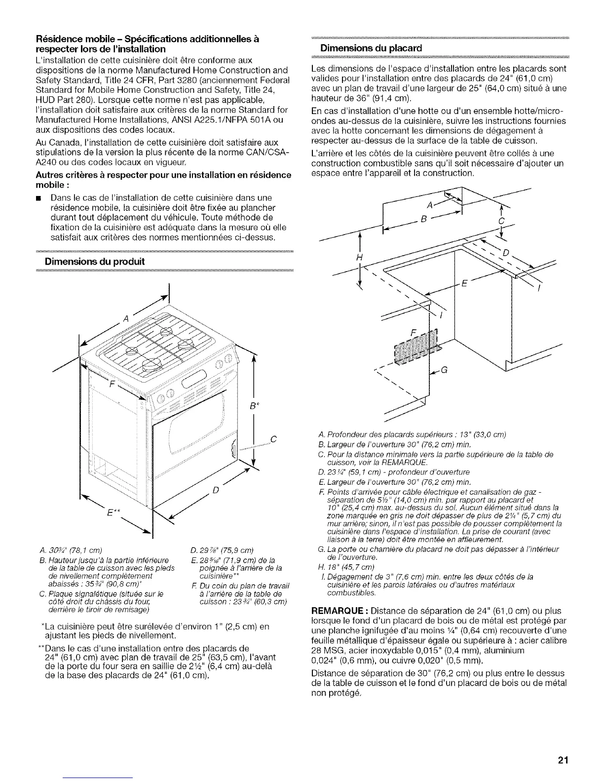 Distance de separation de 30" (76,2 cm) ou plus entre le dessus