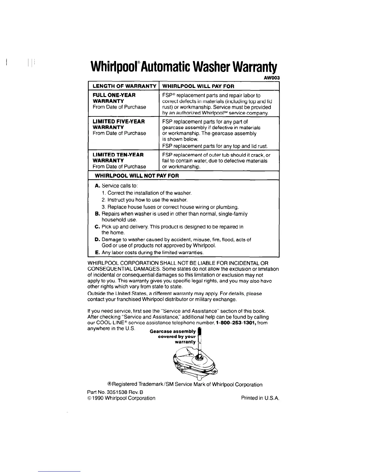 WHIRLPOOL CORPORATION SHALL NOT BE LIABLE FOR INCIDENTAL OR