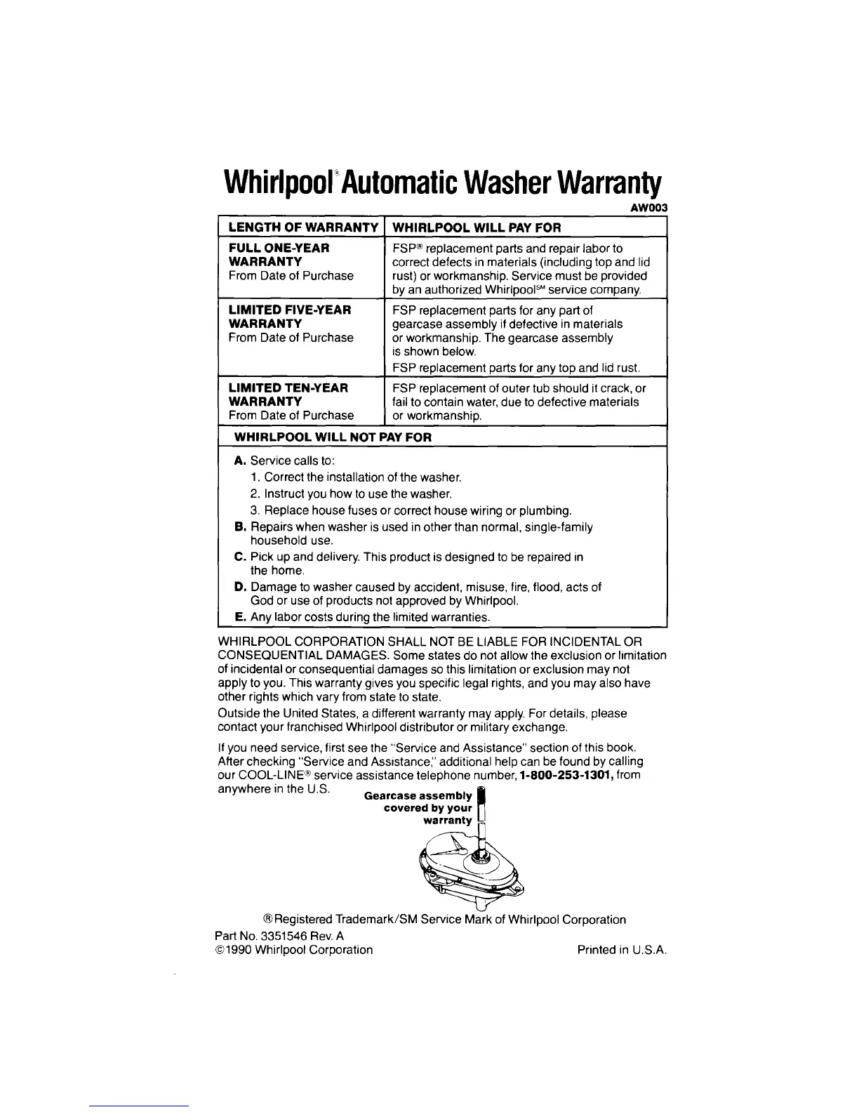 Whirlpool LA8800XT - Whirlpool Automatic Washer Warranty