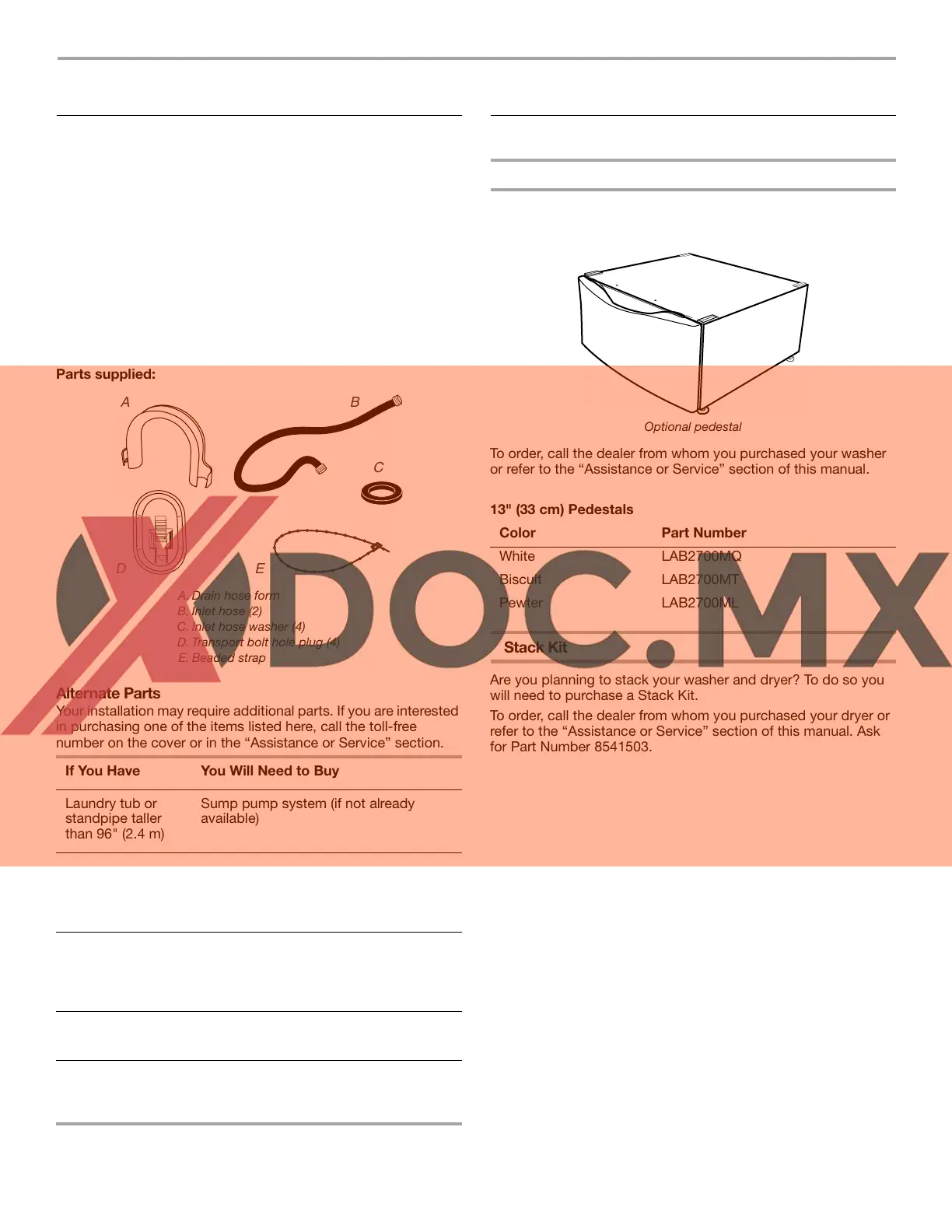 To order, call the dealer from whom you purchased your washer