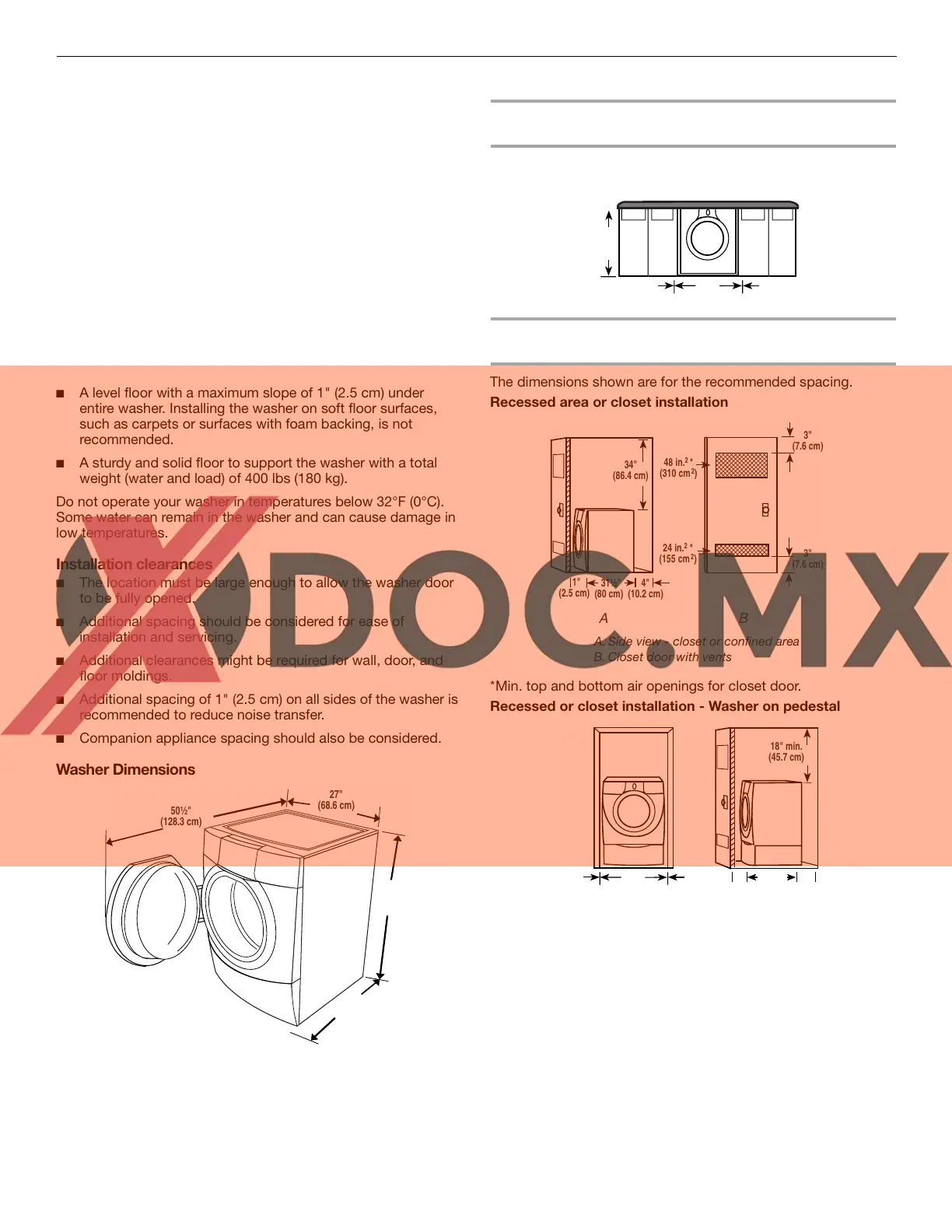 ■ Additional spacing of 1" (2.5 cm) on all sides of the washer is