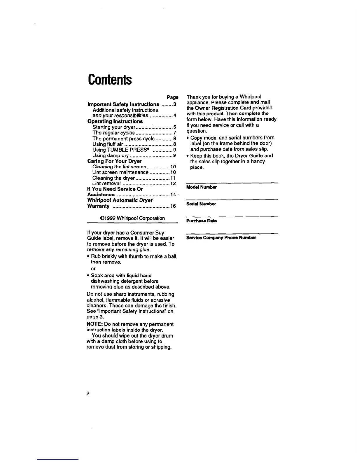 Keep this book, the Dryer Guide and