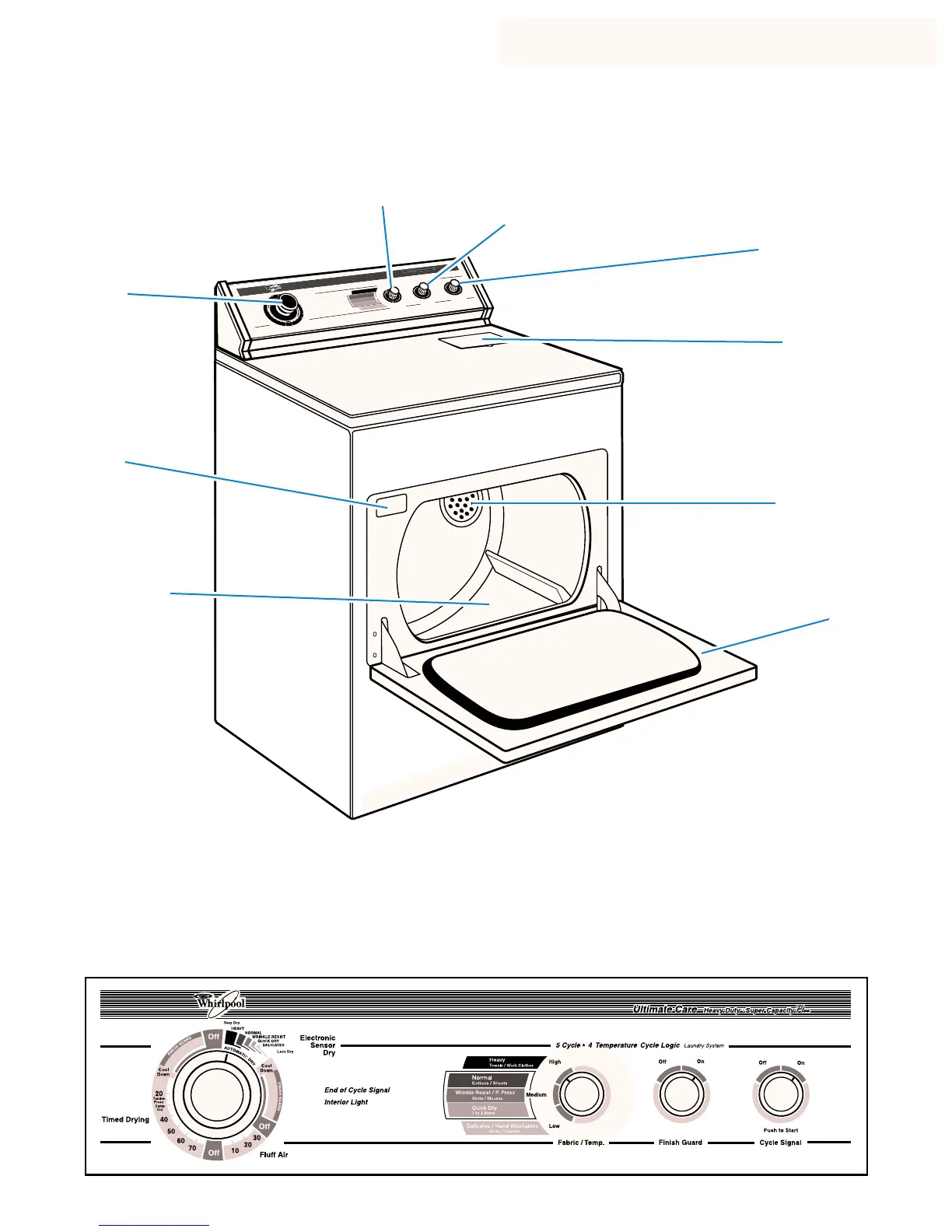 The parts and features of your dryer are illustrated on this page. Become familiar with all parts and