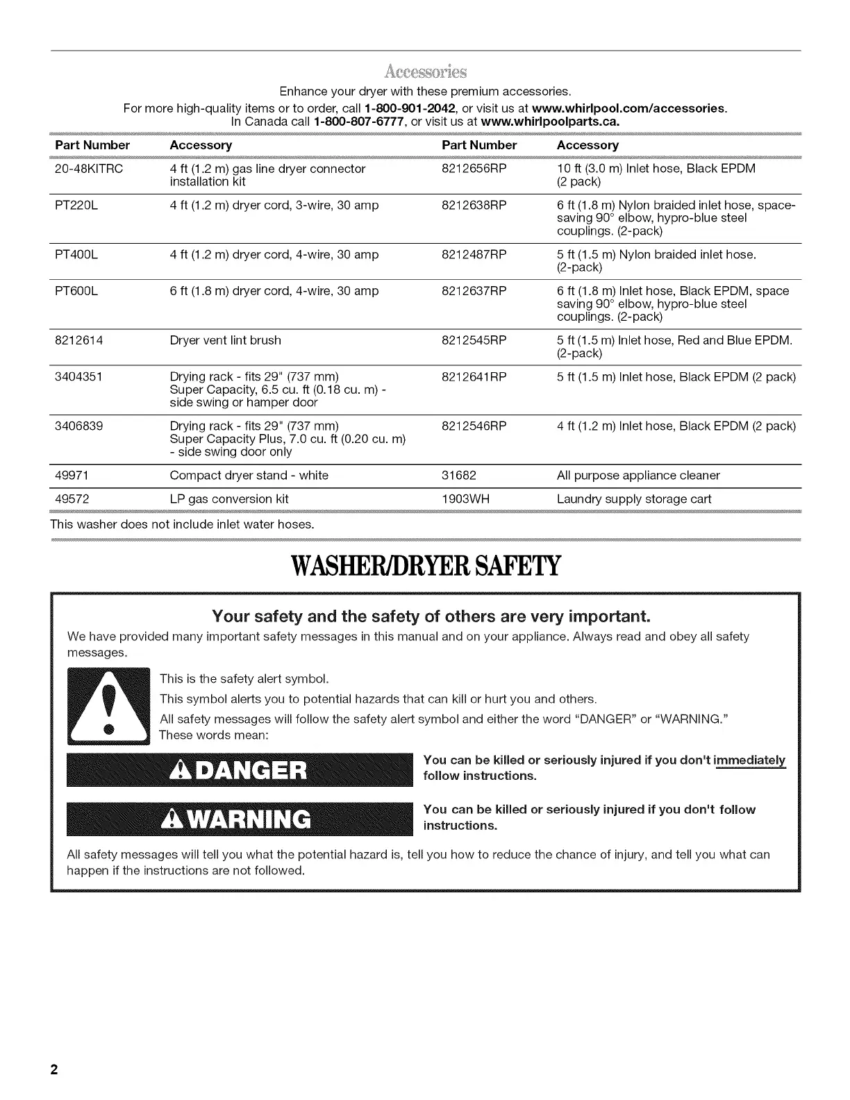 PT400L 4 ft (1.2 m) dryer cord, 4-wire, 30 amp 8212487RP 5 ft (1.5 m) Nylon braided inlet hose.