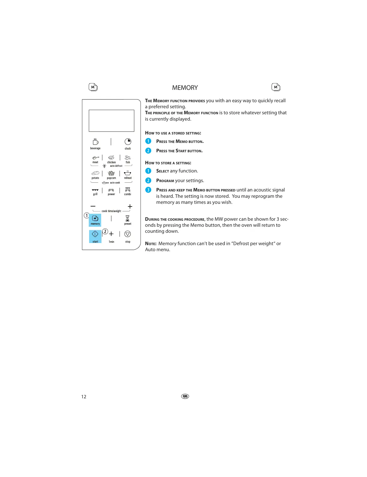 NOTE: Memory function can’t be used in “Defrost per weight“ or
