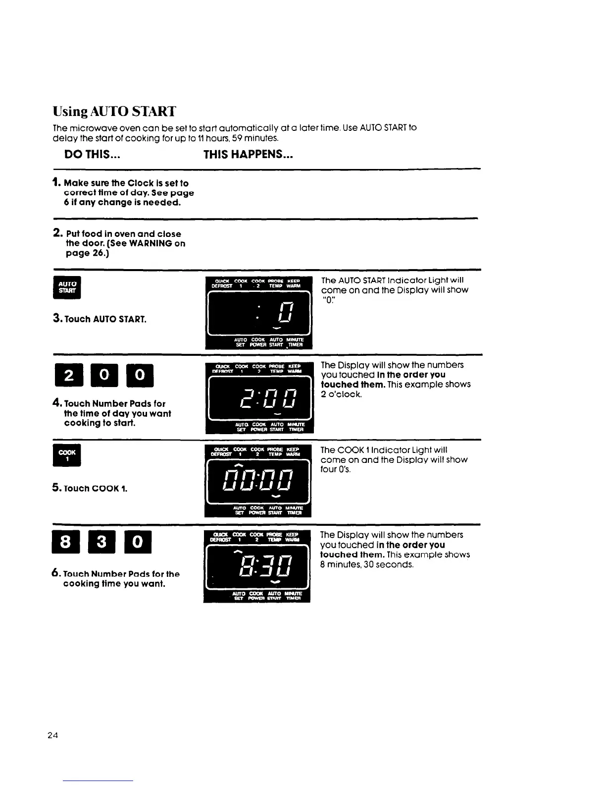 The microwave oven can be set to start automatically at a later time. Use AUTO START to