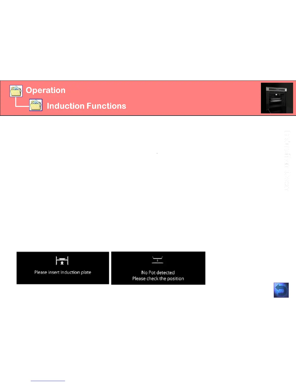 To access the induction functions on the user interface, the induction plate must be properly
