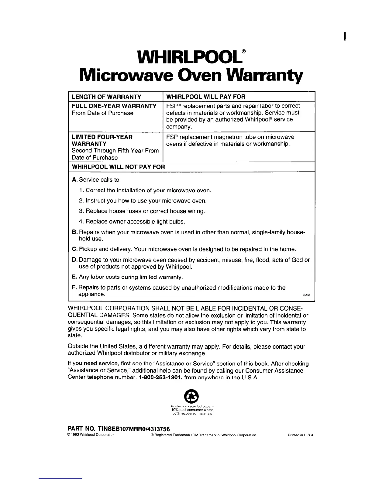 WHIRLPOOL CORPORATION SHALL NOT BE LIABLE FOR INCIDENTAL OR CONSE-