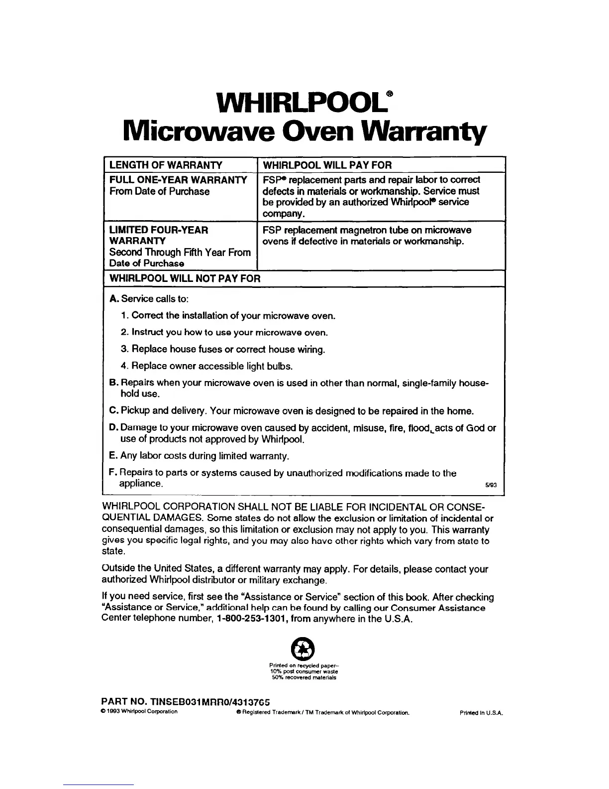 WHIRLPOOL CORPORATION SHALL NOT BE LIABLE FOR INCIDENTAL OR CONSE-