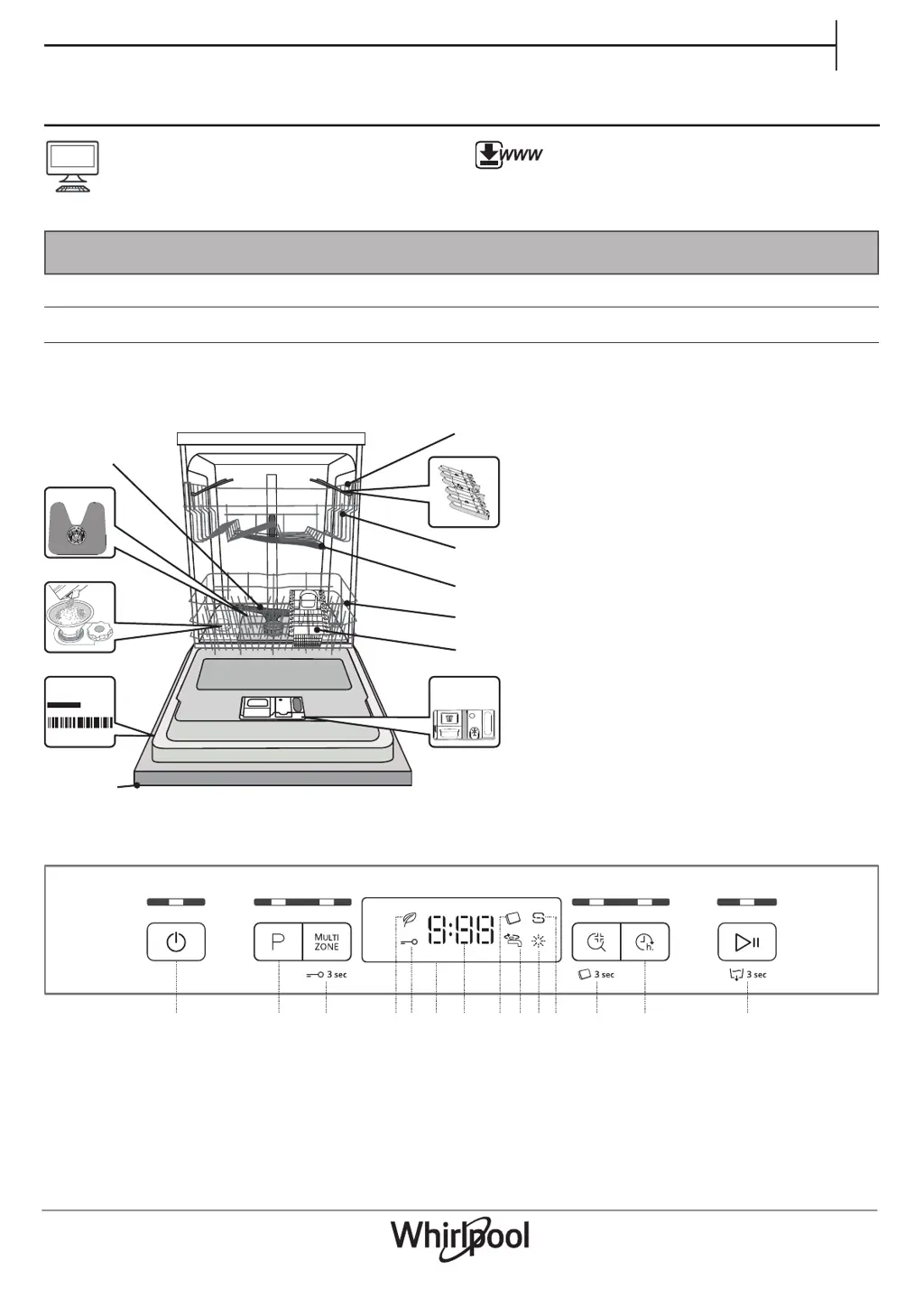 If your Whirlpool Dishwasher isn't starting or responding, there are several possible causes: * Ensure the dishwasher is properly plugged into the socket. * If there was a power outage, press the START/Pause button to resume the cycle, as the dishwasher will not restart automatically. * Make sure the dishwasher door is fully closed until you hear a 'click'. * If the cycle was interrupted by opening the door for more than 4 seconds, close the door and press START/Pause. * If the display shows F9 or F12 and the On/Off and START/Pause LEDs are blinking rapidly, switch the appliance off and then back on after one minute. If the problem continues, unplug the dishwasher for one minute and then plug it back in.