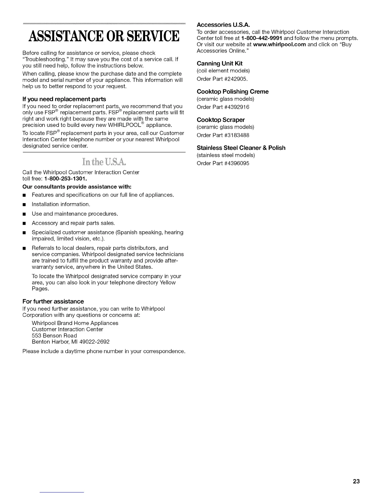 To order accessories, call the Whirlpool Customer Interaction