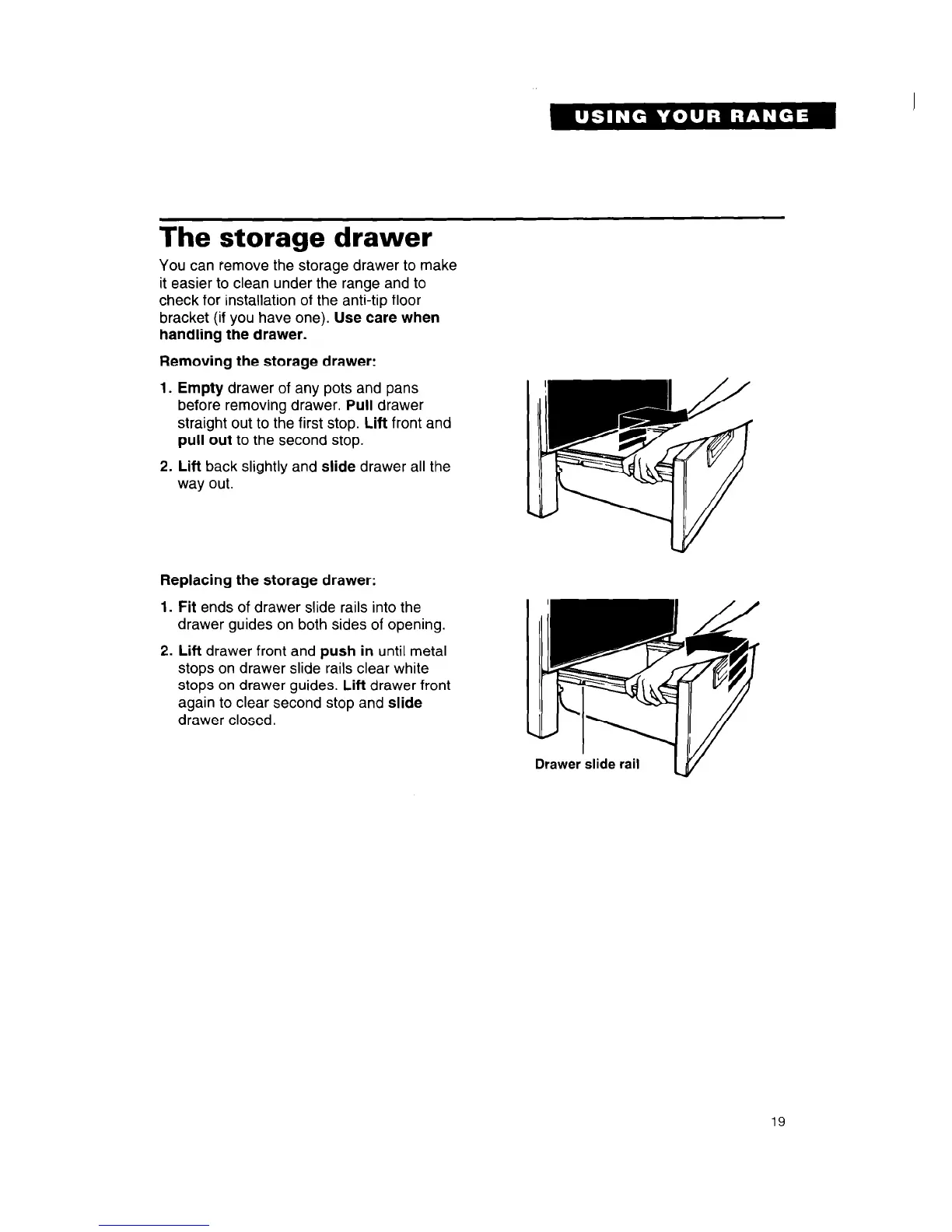 stops on drawer guides. Lift drawer front