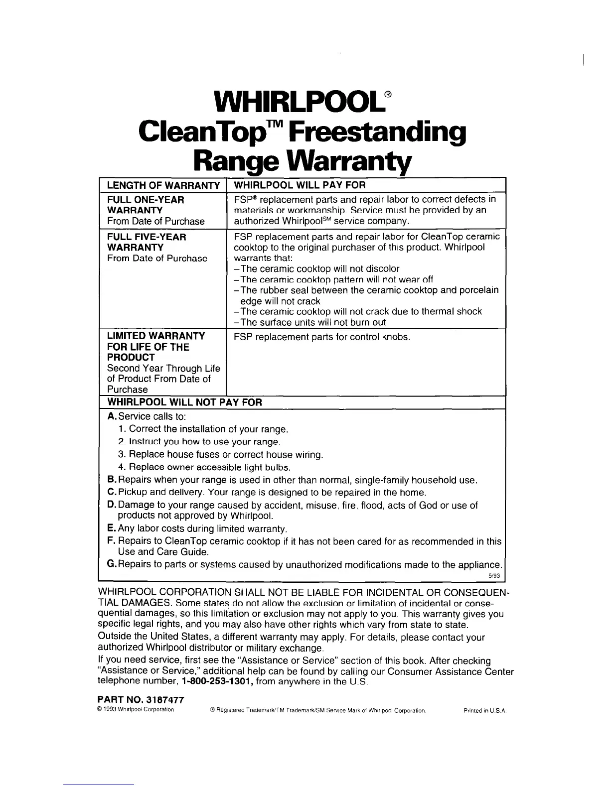 WHIRLPOOL CORPORATION SHALL NOT BE LIABLE FOR INCIDENTAL OR CONSEQUEN-