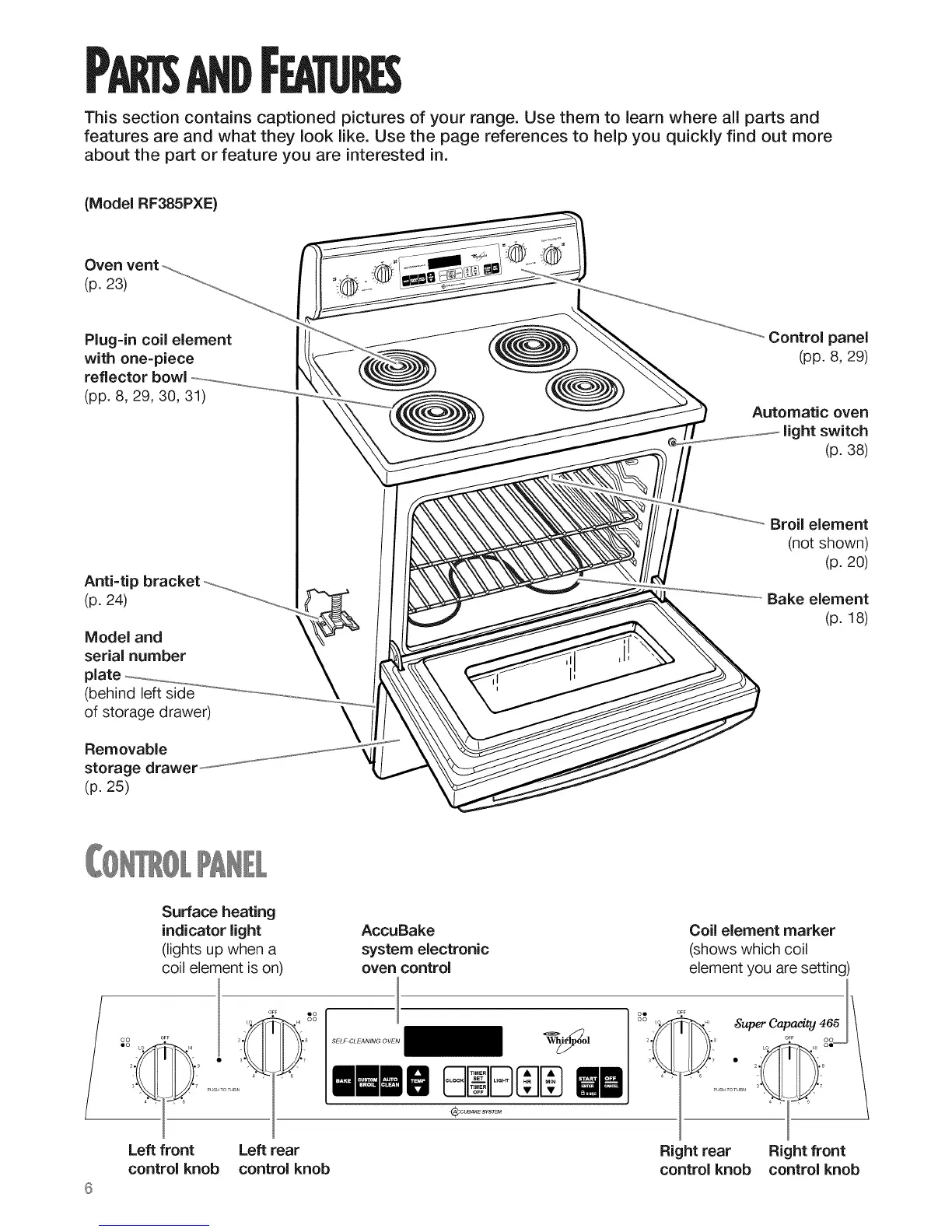 This section contains captioned pictures of your range. Use them to learn where all parts and