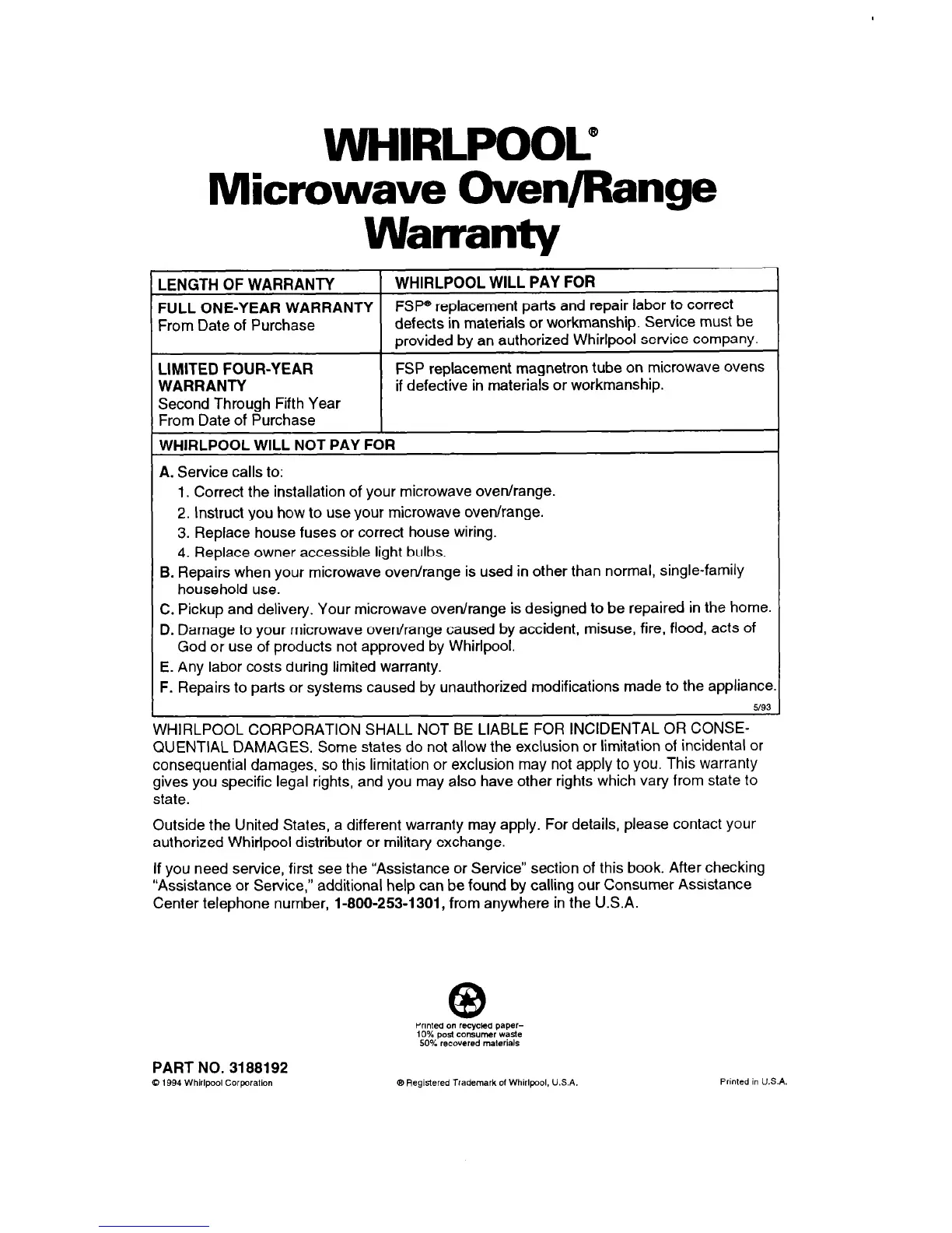WHIRLPOOL CORPORATION SHALL NOT BE LIABLE FOR INCIDENTAL OR CONSE-