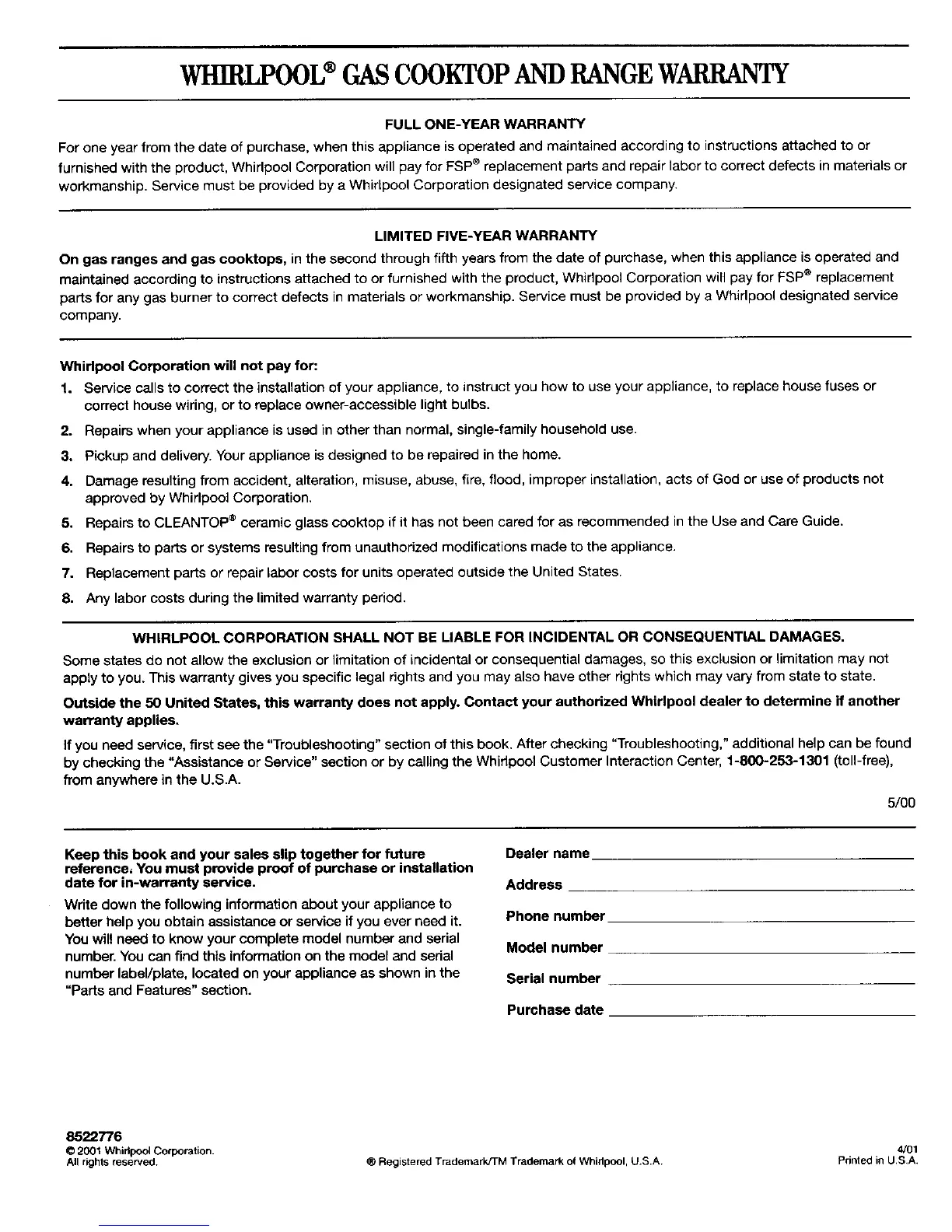 WHIRLPOOL®GASCOOKTOPANDRANGEWARRANTY