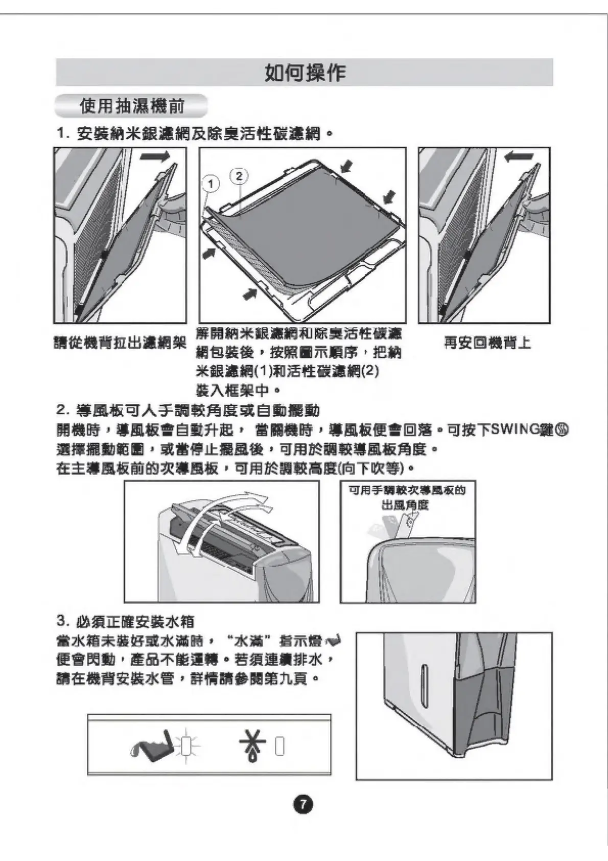 Whirlpool SS209 - Operating Instructions; Filter Installation Guide; Louver Adjustment Instructions; Water Tank Fitting Procedure