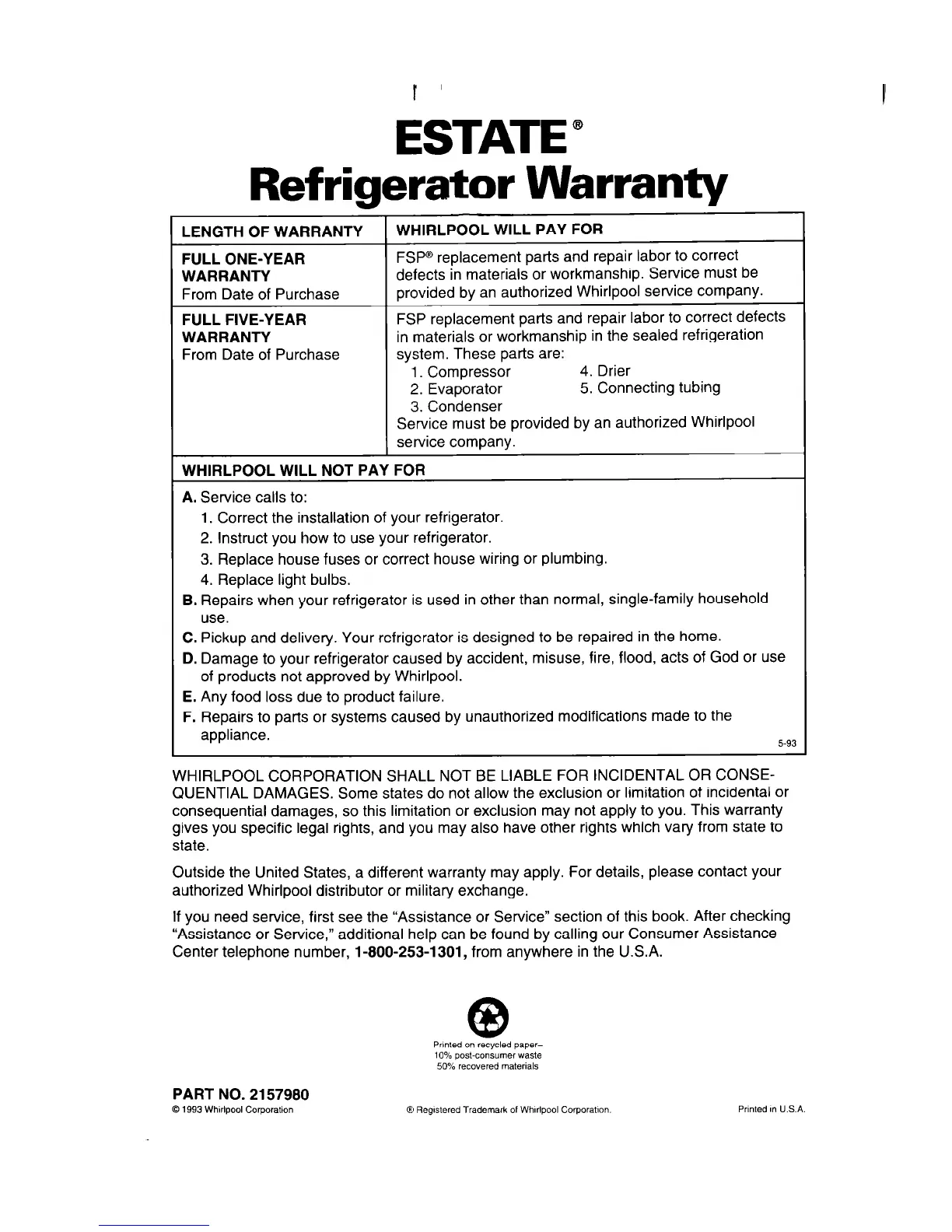 WHIRLPOOL CORPORATION SHALL NOT BE LIABLE FOR INCIDENTAL OR CONSE-