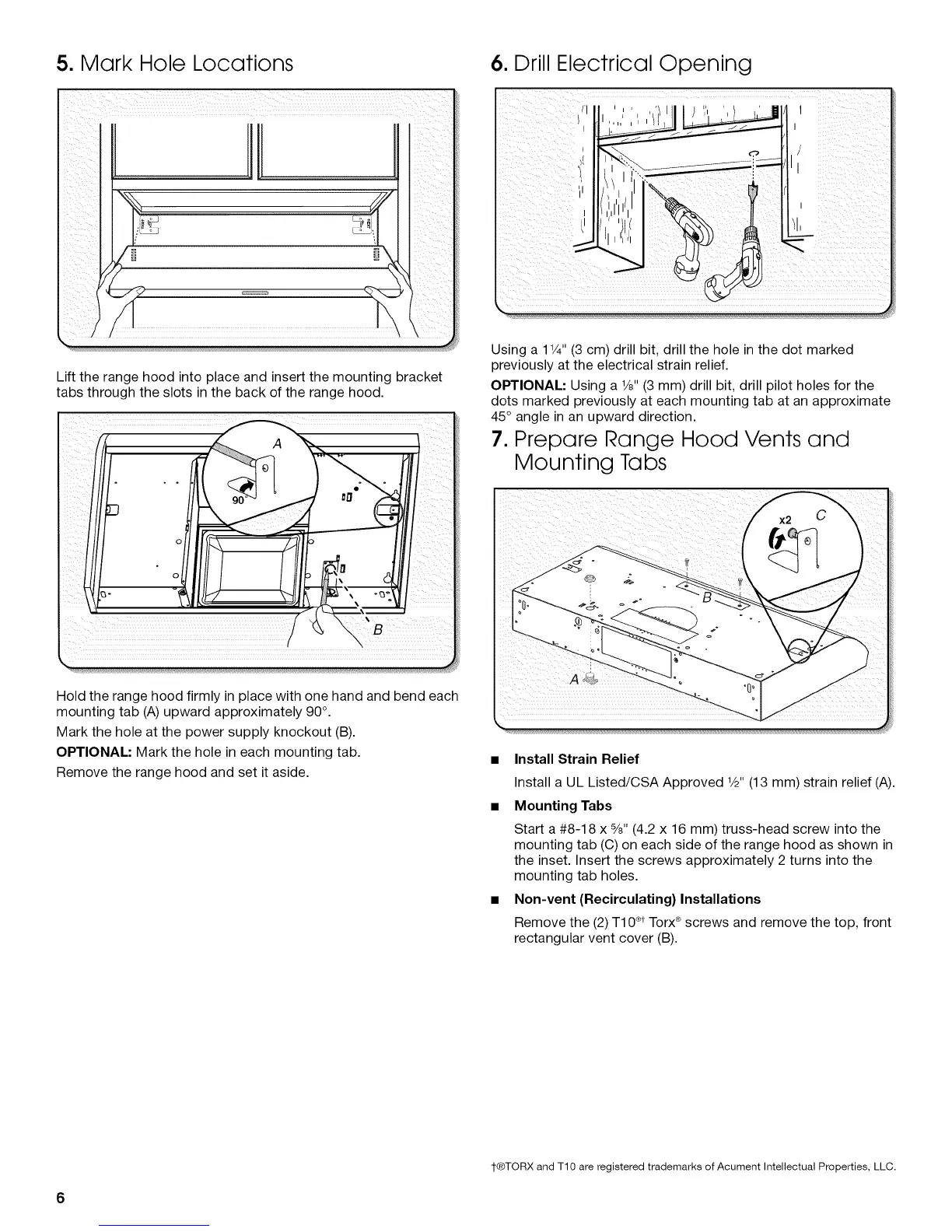 mounting tab (C) on each side of the range hood as shown in