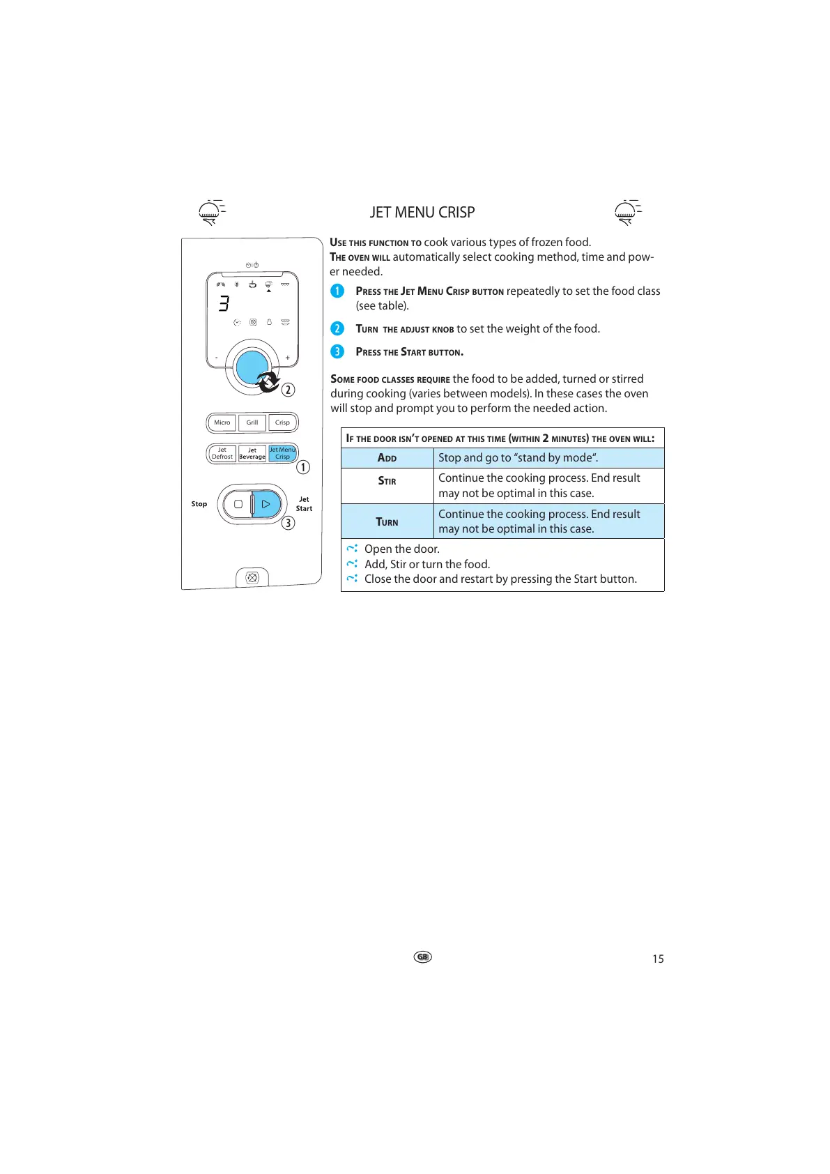 PRESS THE JET MENU CRISP BUTTON repeatedly to set the food class
