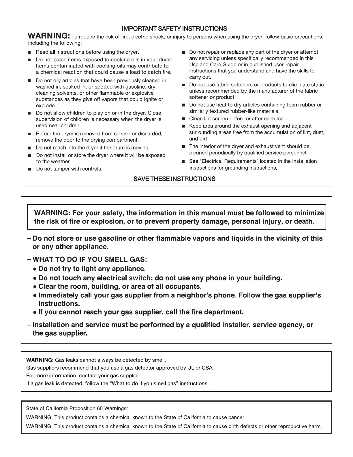 Whirlpool W10096986A - Important Safety Instructions; General Precautions; Gas Leak Procedures; California Proposition 65 Warnings