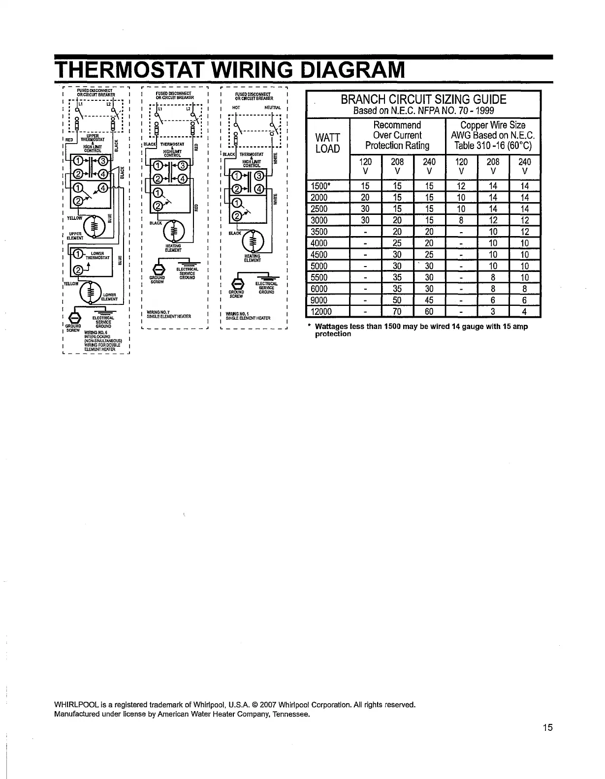 Wattages less than 1500 may be wired 14 gauge with 15 amp