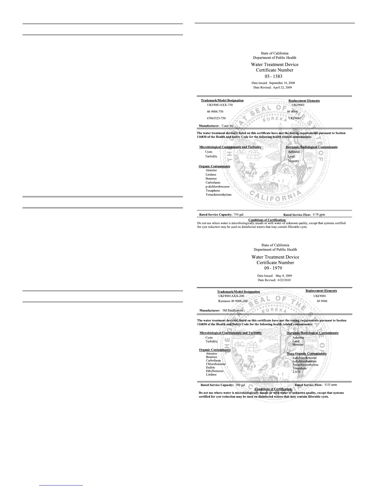 WATER FILTER CERTIFICATIONS
