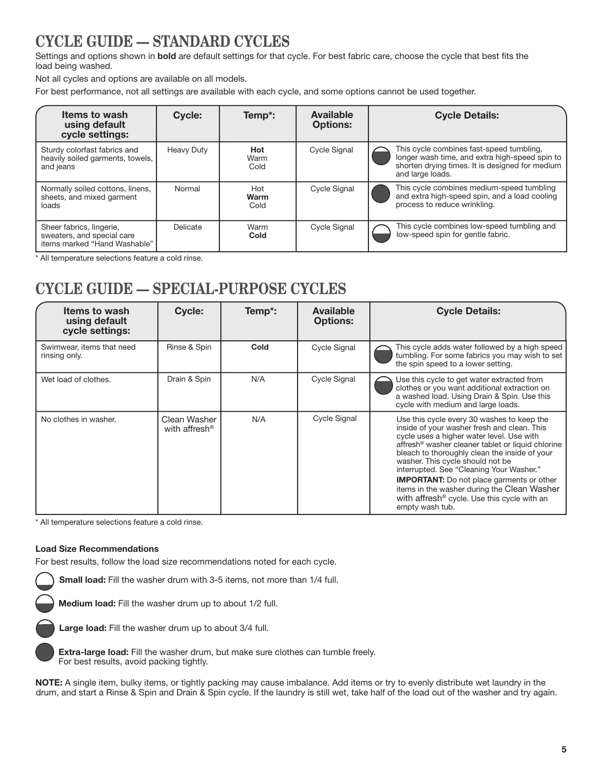 For best results, follow the load size recommendations noted for each cycle.