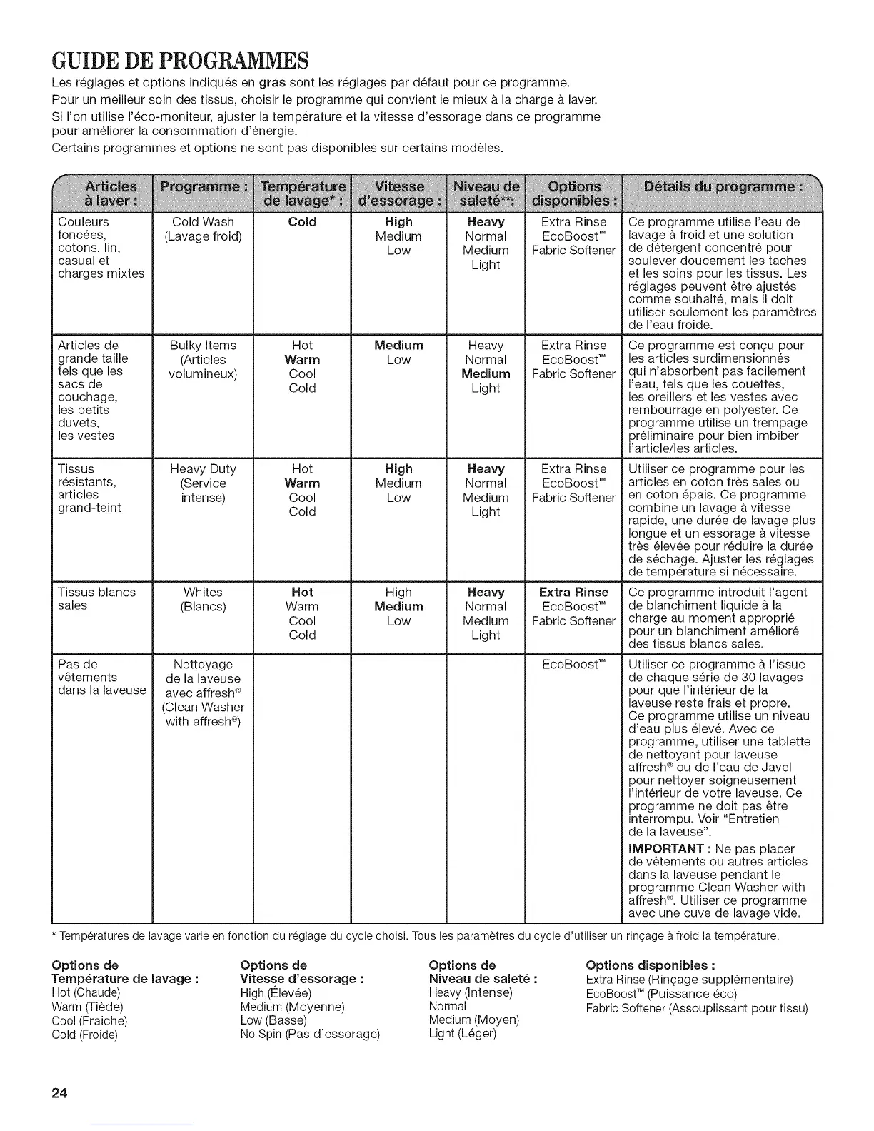 Pour un meilleur soin des tissus, choisir le programme qui convient le mieux & la charge a laver.