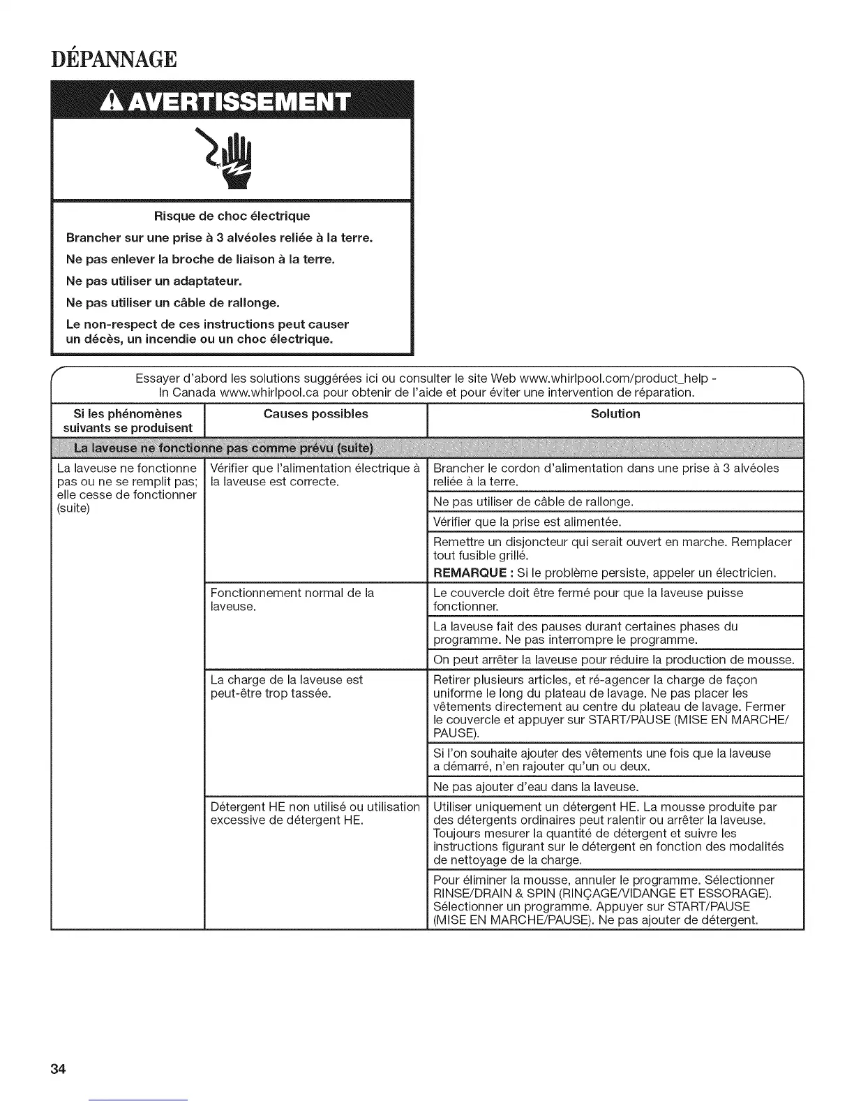 Essayer d'abord les solutions sugg@6es ici ou consulter le site Web www.whirlpool.com/product_help -