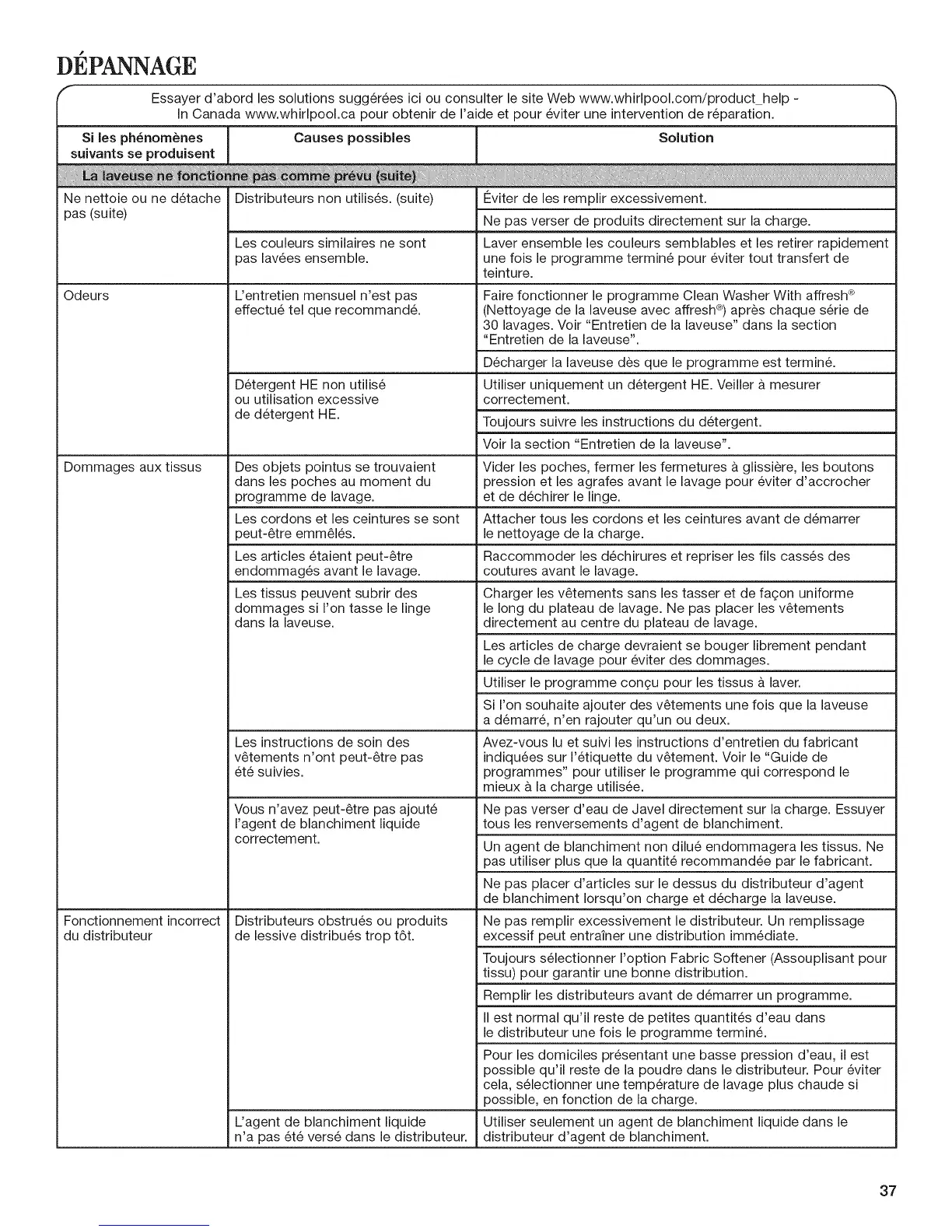 In Canada www.whirlpool.ca pour obtenir de I'aide et pour 6viter une intervention de r6paration.