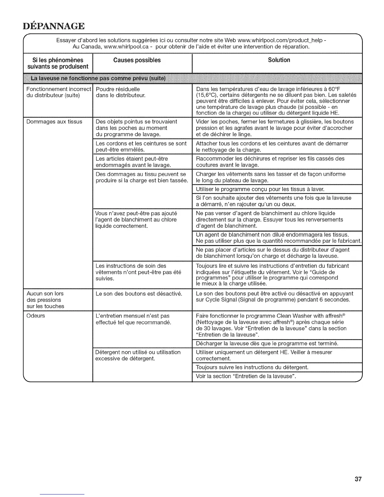 Essayer d'abord les solutions sugg6r6es ici ou consulter notre site Web www.whirlpool.com/product_help -