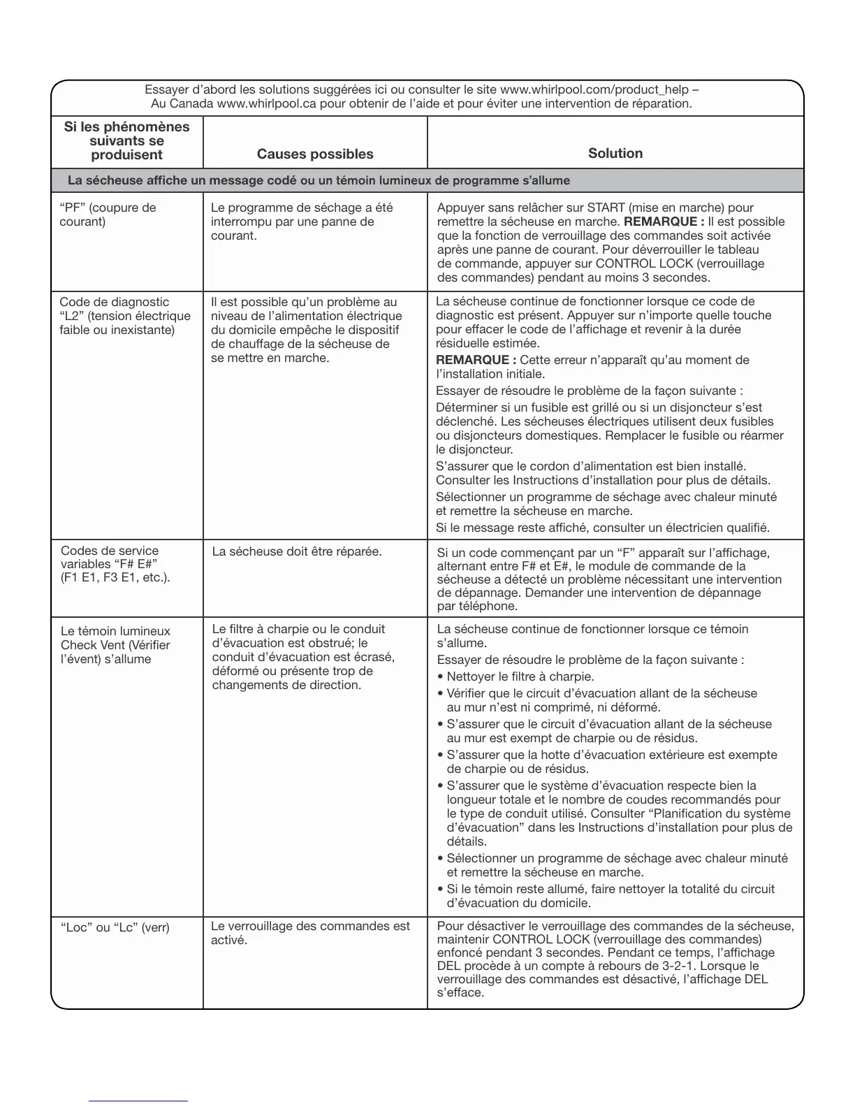 Au Canada www.whirlpool.ca pour obtenir de lâaide et pour Ă©viter une intervention de rĂ©paration.