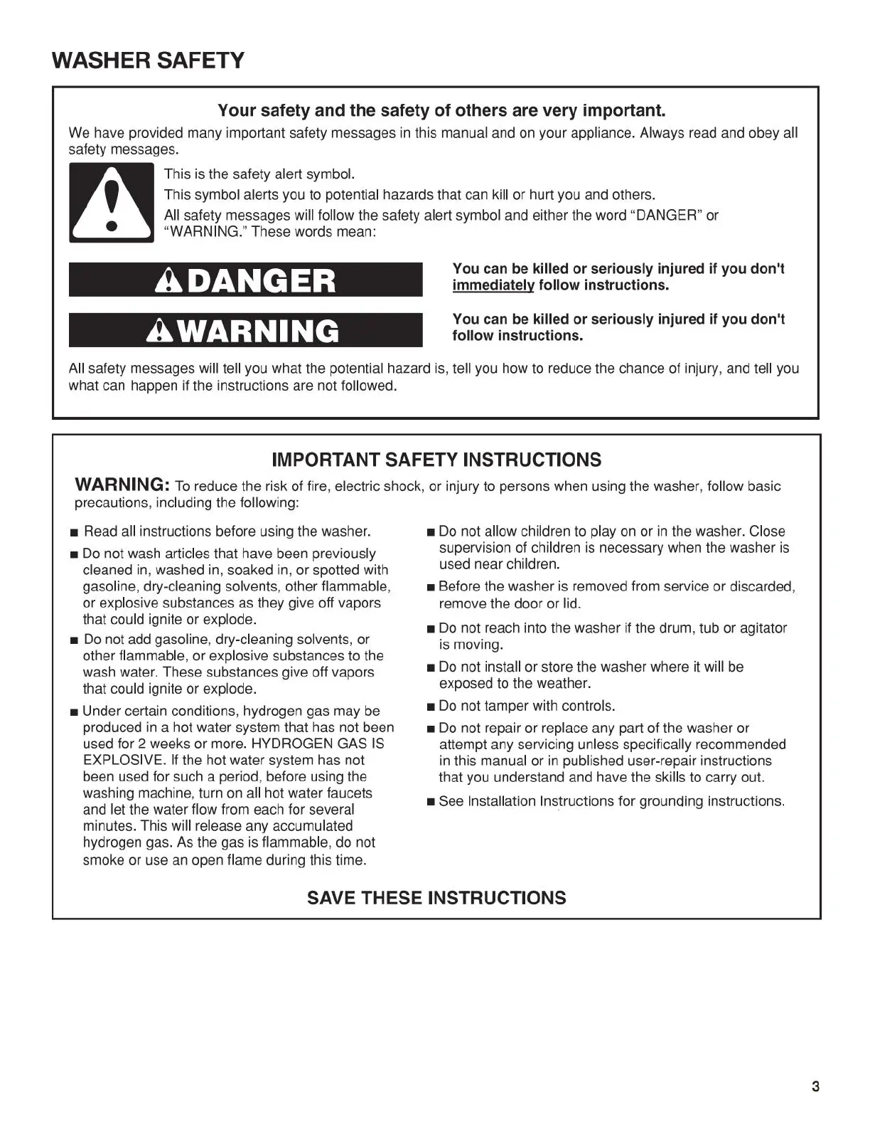 Whirlpool W11156985A - Washer Safety Precautions; Critical Safety Instructions for Operation