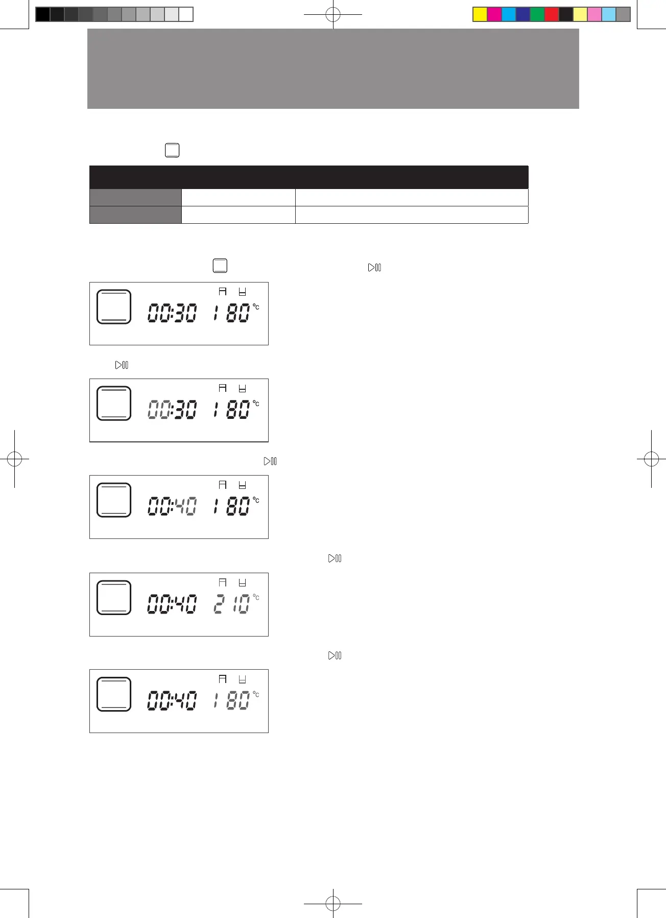 例如:設置烹調時間為 40 分鐘,頂部發熱管溫度為 200°C,底部發熱管溫度為 180°C。