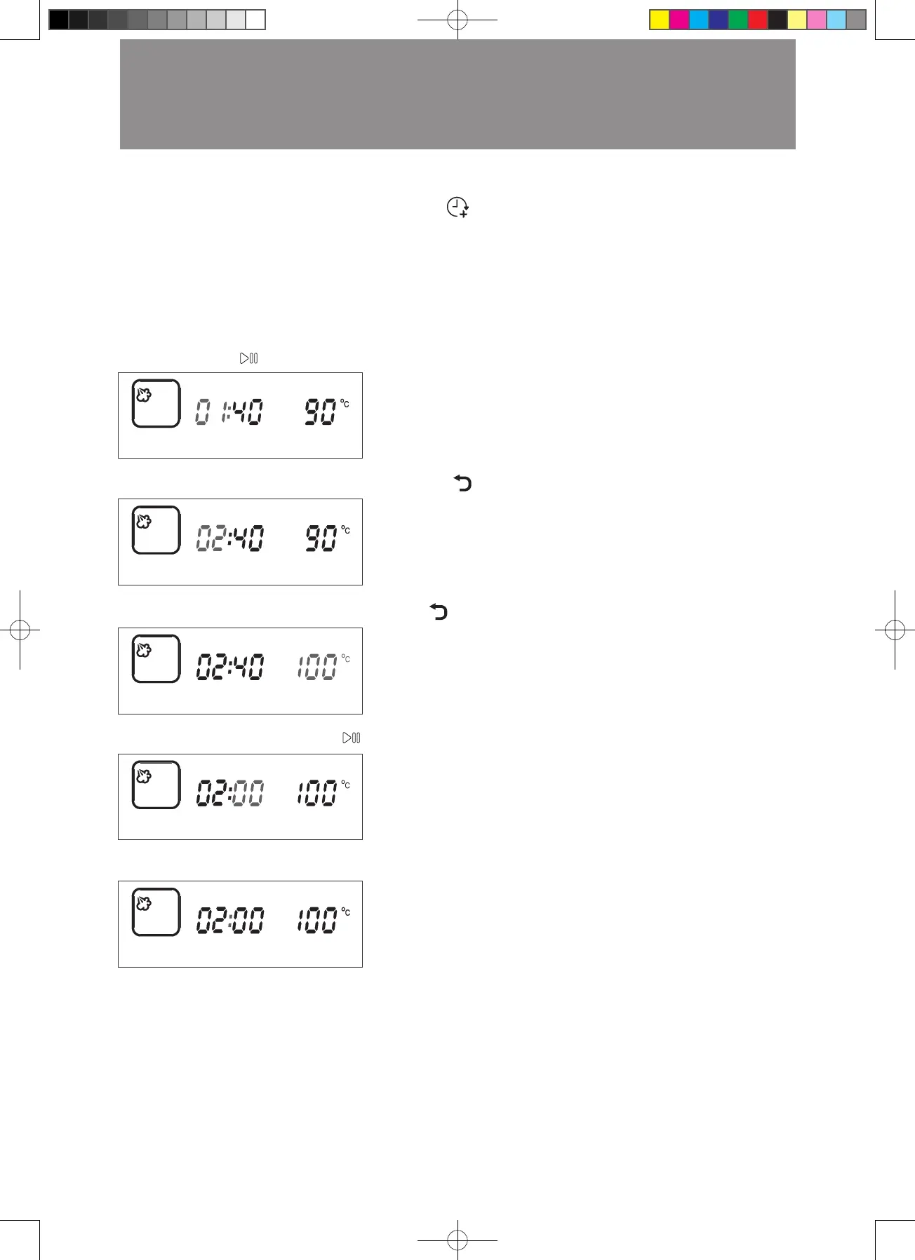 例如:已設定的烹調時間 01:40 和溫度 90°C,改為烹調時間 02:00 及溫度 100°C。
