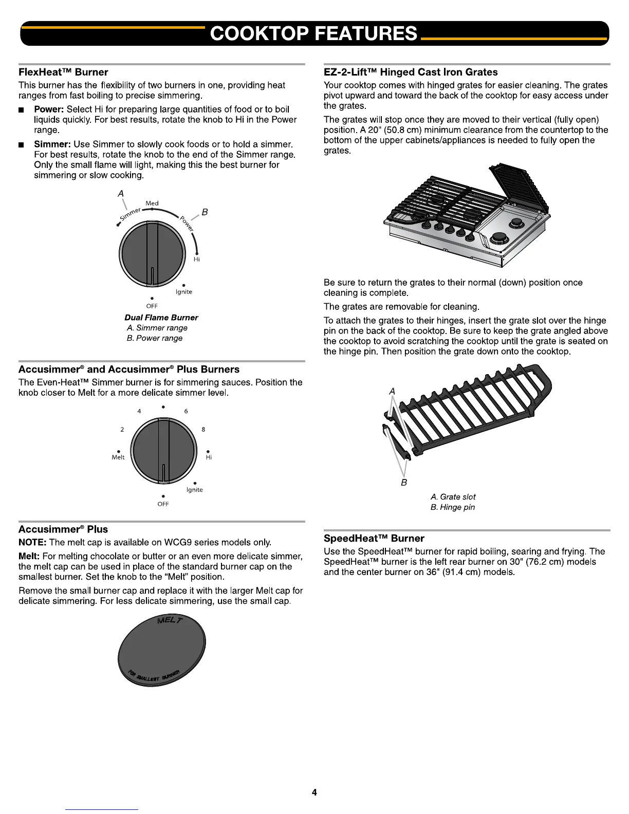 Whirlpool WCG51US6DB - Cooktop Features; FlexHeat Burner Functionality; Accusimmer Burner Operation; SpeedHeat Burner Usage