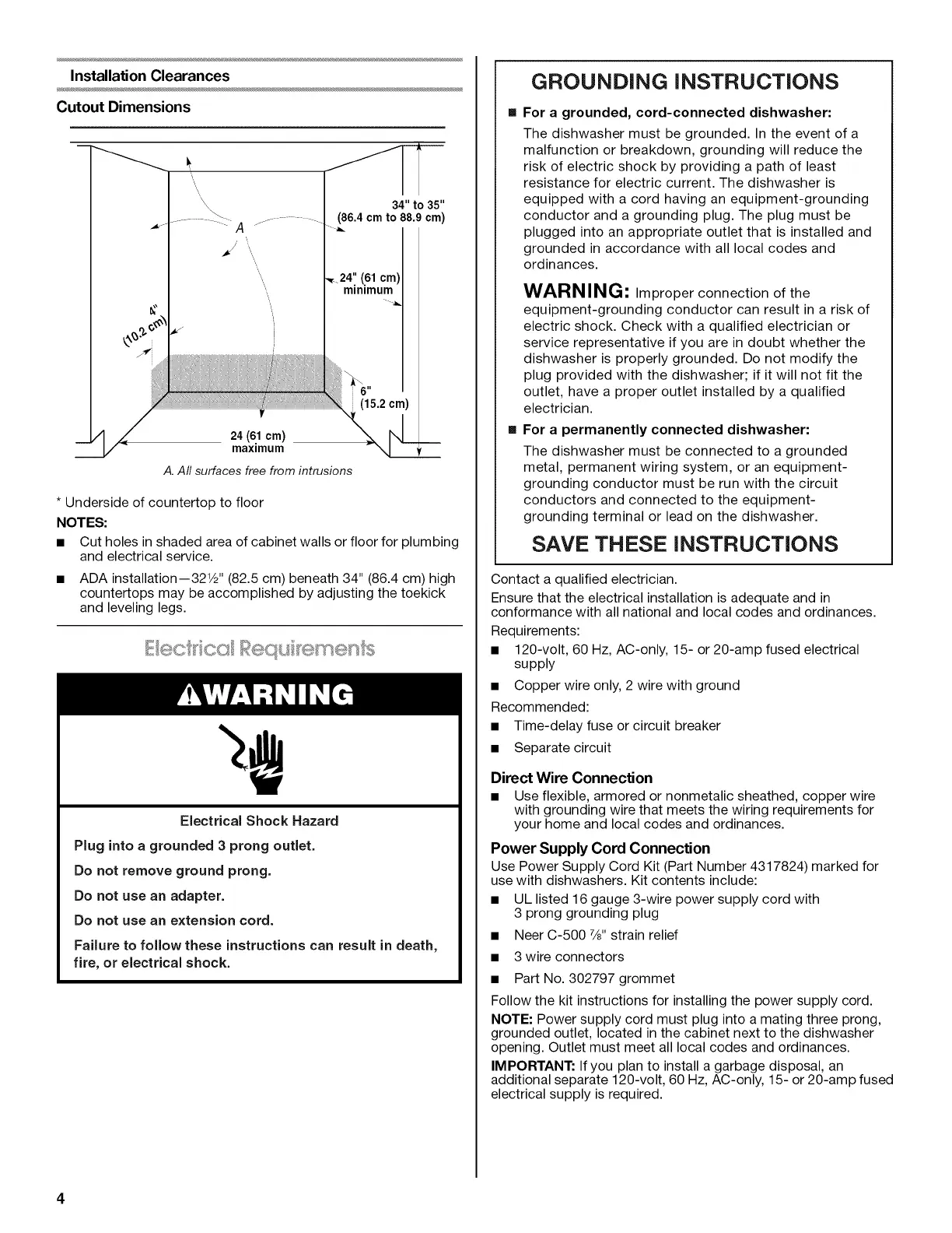 Whirlpool WDF550SAAW - GROUNDING INSTRUCTIONS; Electrical Requirements; Direct Wire Connection; Power Supply Cord Connection