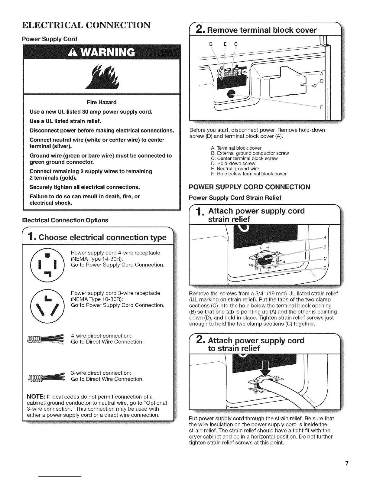 down (D), and hold in place. Tighten strain relief screws just