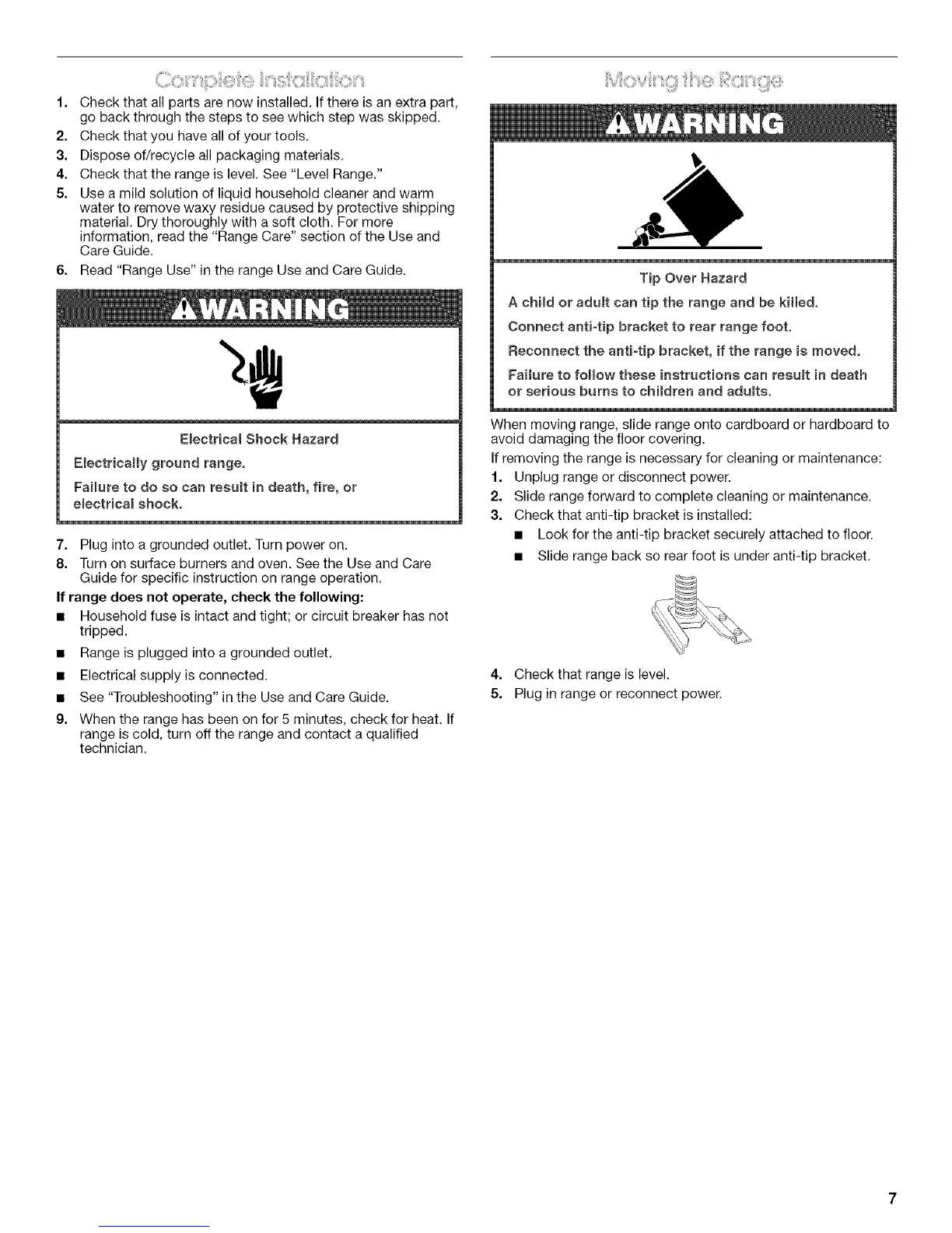 Reconnect the anti-tip bracket, if the range is moved.