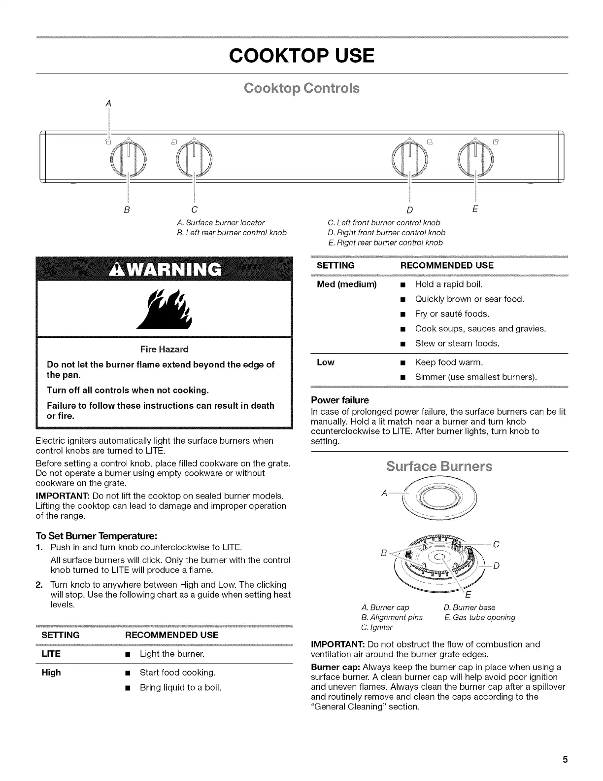 Burner cap: Always keep the burner cap in place when using a