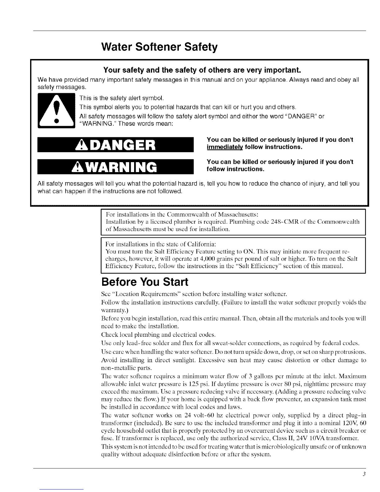 Follow the installation instructions carefully. (Failure to install the water softener properly voids the