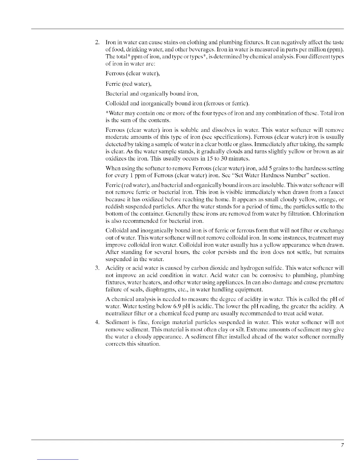 out of water. This water softener will not remove colloidal iron. In some instances, treatment may