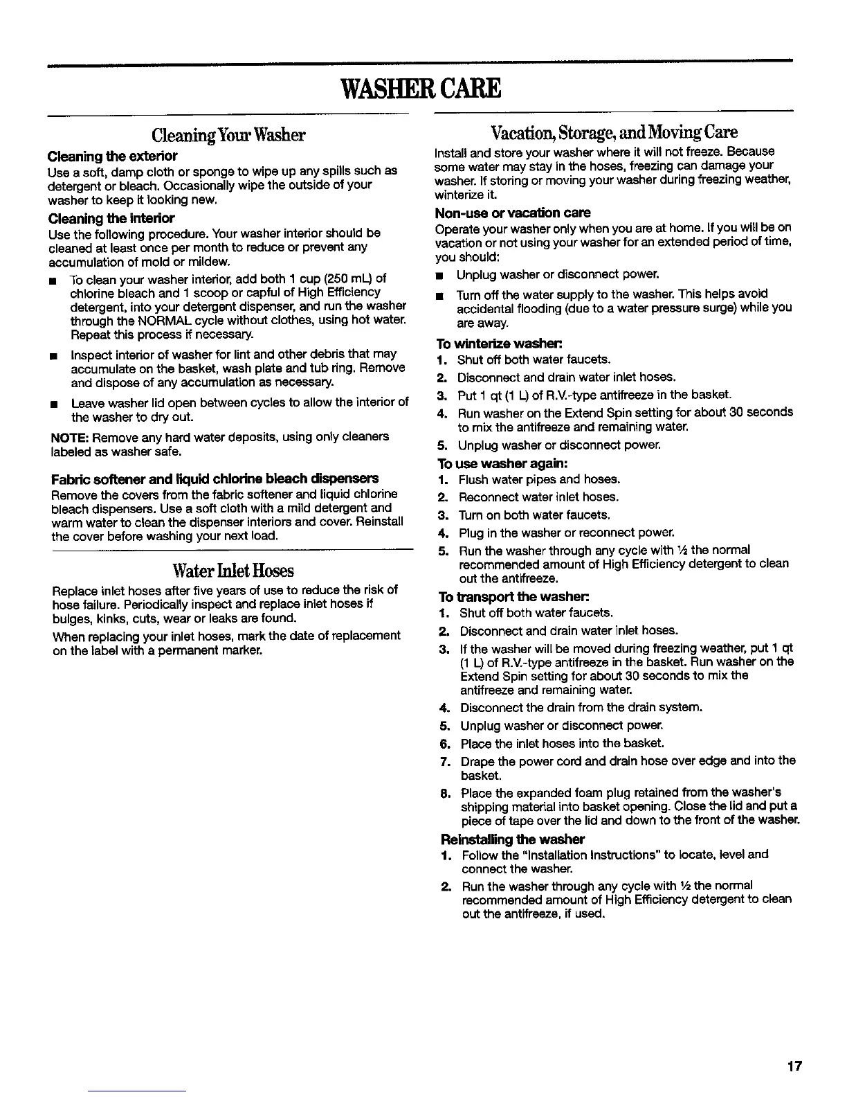 washer. If storing or moving your washer during freezing weather,