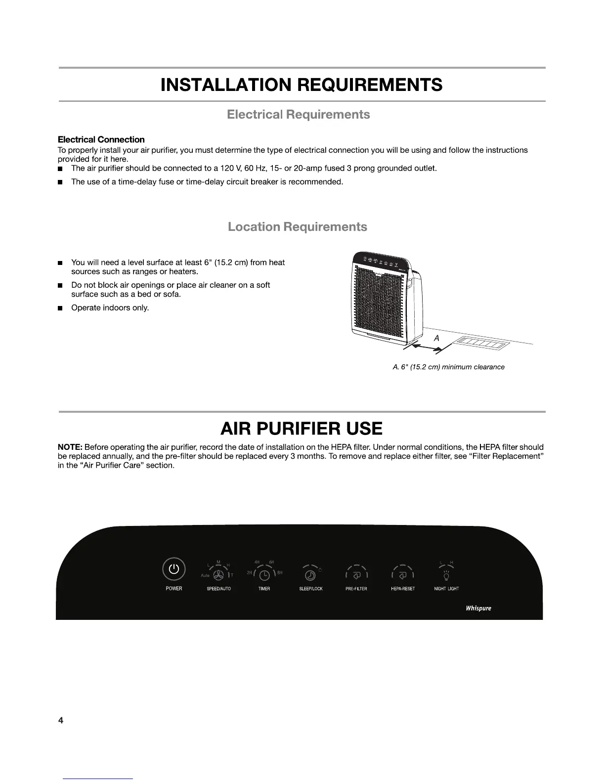 Whirlpool WHISPURE WPPRO2000 - Installation Requirements; Electrical Connection Requirements; Placement Requirements; Air Purifier Use
