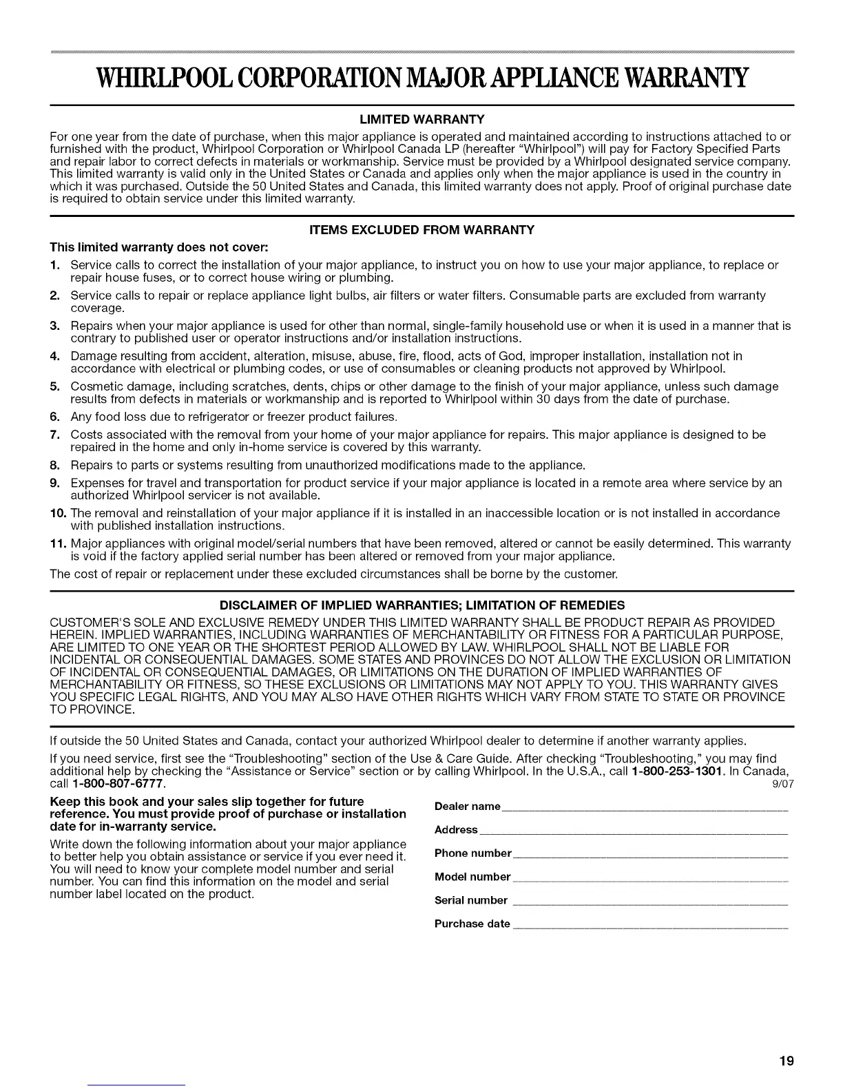 additional help by checking the "Assistance or Service" section or by calling Whirlpool. In the U.S.A., call 1-800-253-1301. In Canada,