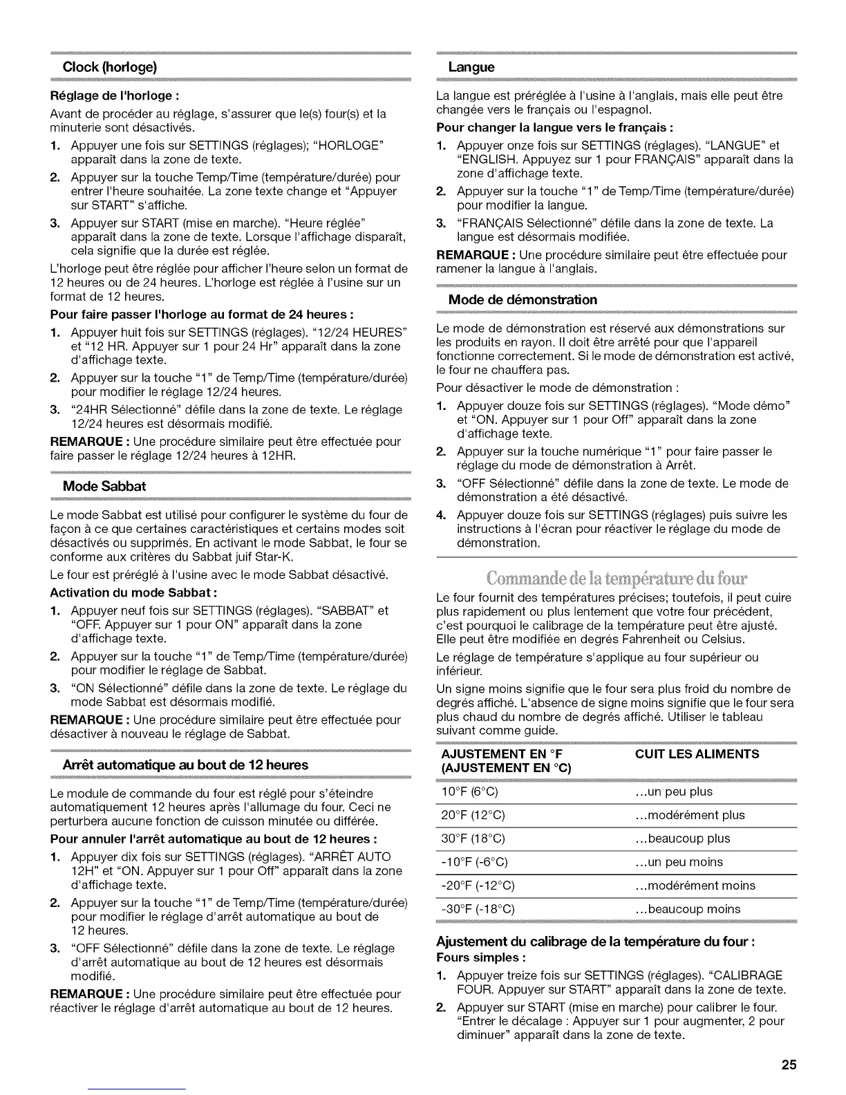 AJUSTEMENT EN °F CUlT LES ALIMENTS