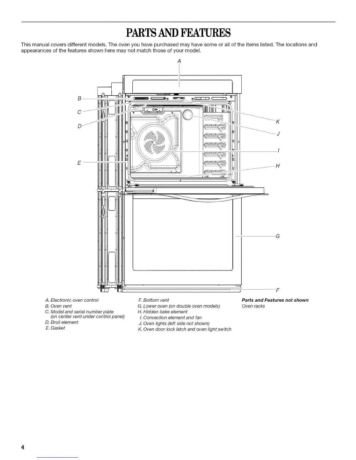This manual covers different models. The oven you have purchased may have some or all of the items listed. The locations and