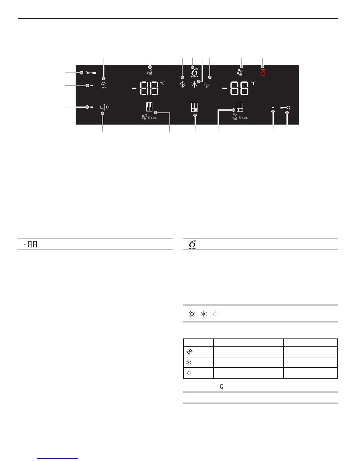 indikatorer. Indikatorerne for temperatur i køleafdelingen og fryseafdelingen viser de sidst indstillede temperaturværdier.
