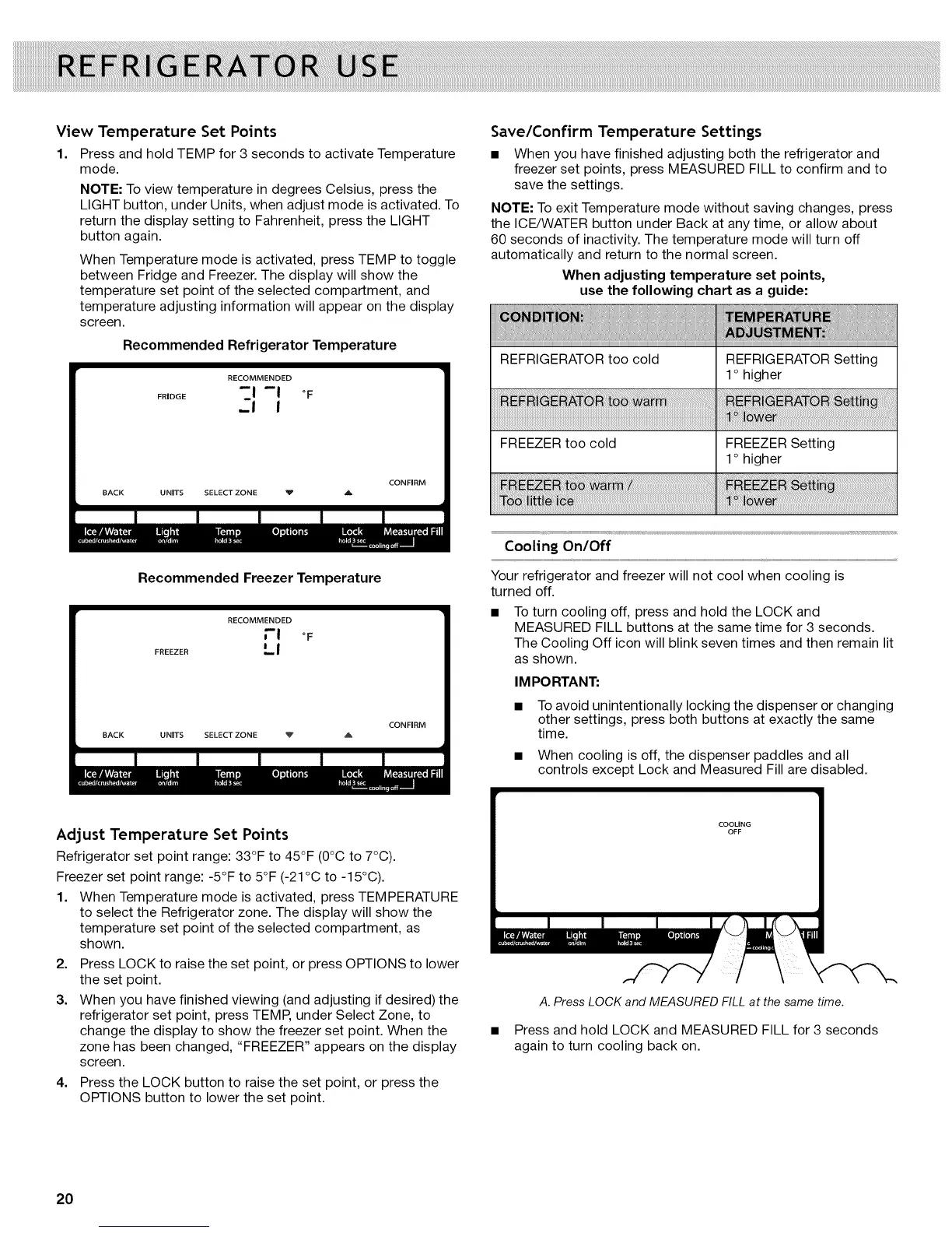 Refrigerator set point range: 33°F to 45°F (0°C to 7°C).
